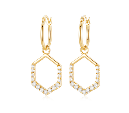 Geometric elegance meets radiant sparkle in these 14K gold hexagon dangle hoop earrings.