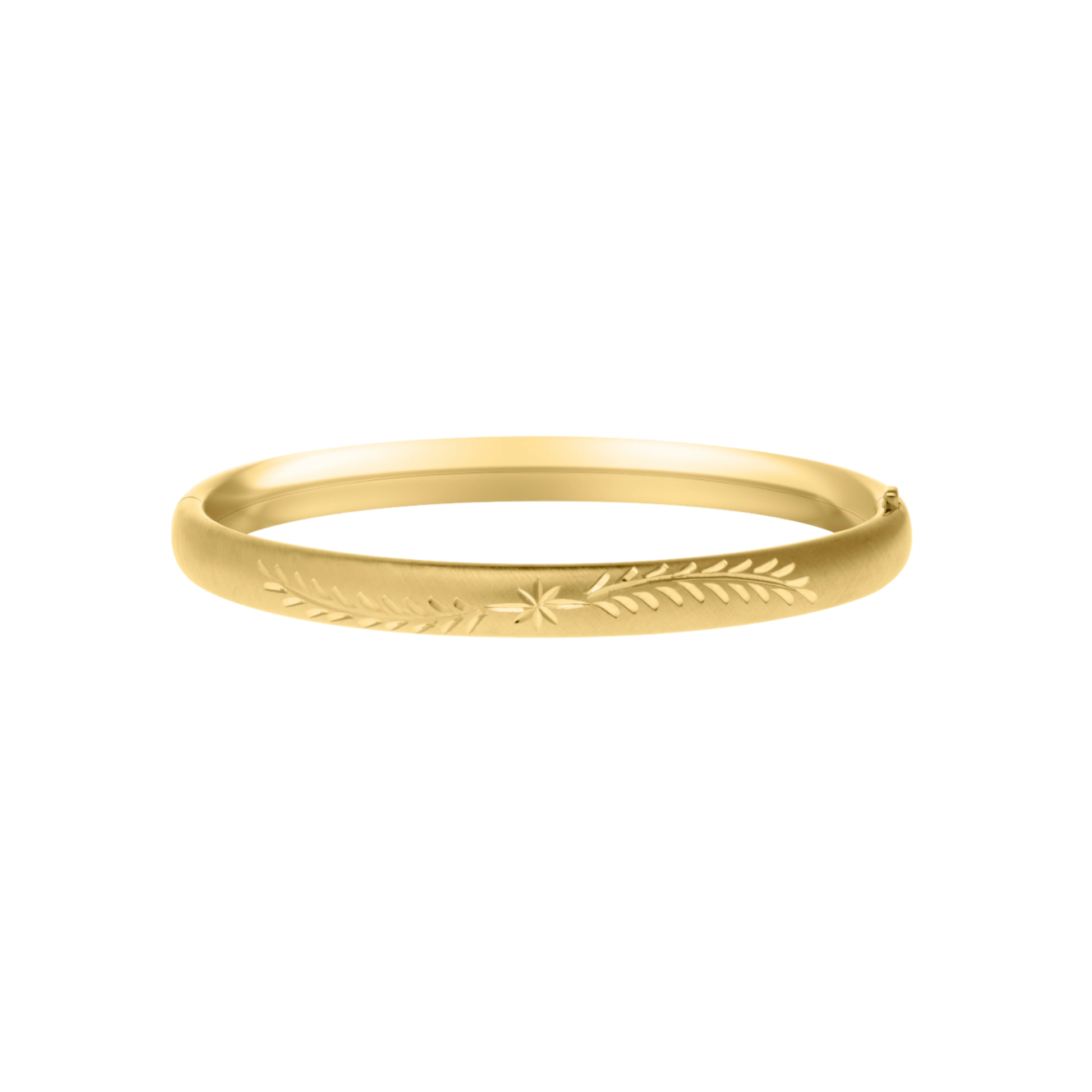 Crafted in radiant 14K gold filled metal, this children’s bangle features delicate hand-engraved detailing with a charming star design at the center—symbolizing hope, dreams, and the bright future ahead. Its polished finish and timeless style make it a meaningful gift for birthdays, christenings, or special milestones. A keepsake to treasure, made just for your shining star.
