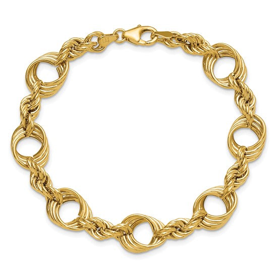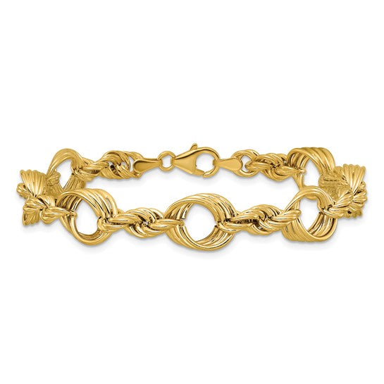 Add a touch of sophistication to your wrist with the 14K Polished Fancy Circle and Rope Link Bracelet. This stunning piece combines the smooth elegance of polished circles with the intricate texture of rope-style links, creating a perfect balance of refinement and style. Crafted from high-quality 14K gold, this bracelet is designed to shine brightly, adding a luxurious flair to both casual and formal outfits. The secure clasp ensures comfort and wearability, making it a versatile addition to any jewelry collection.