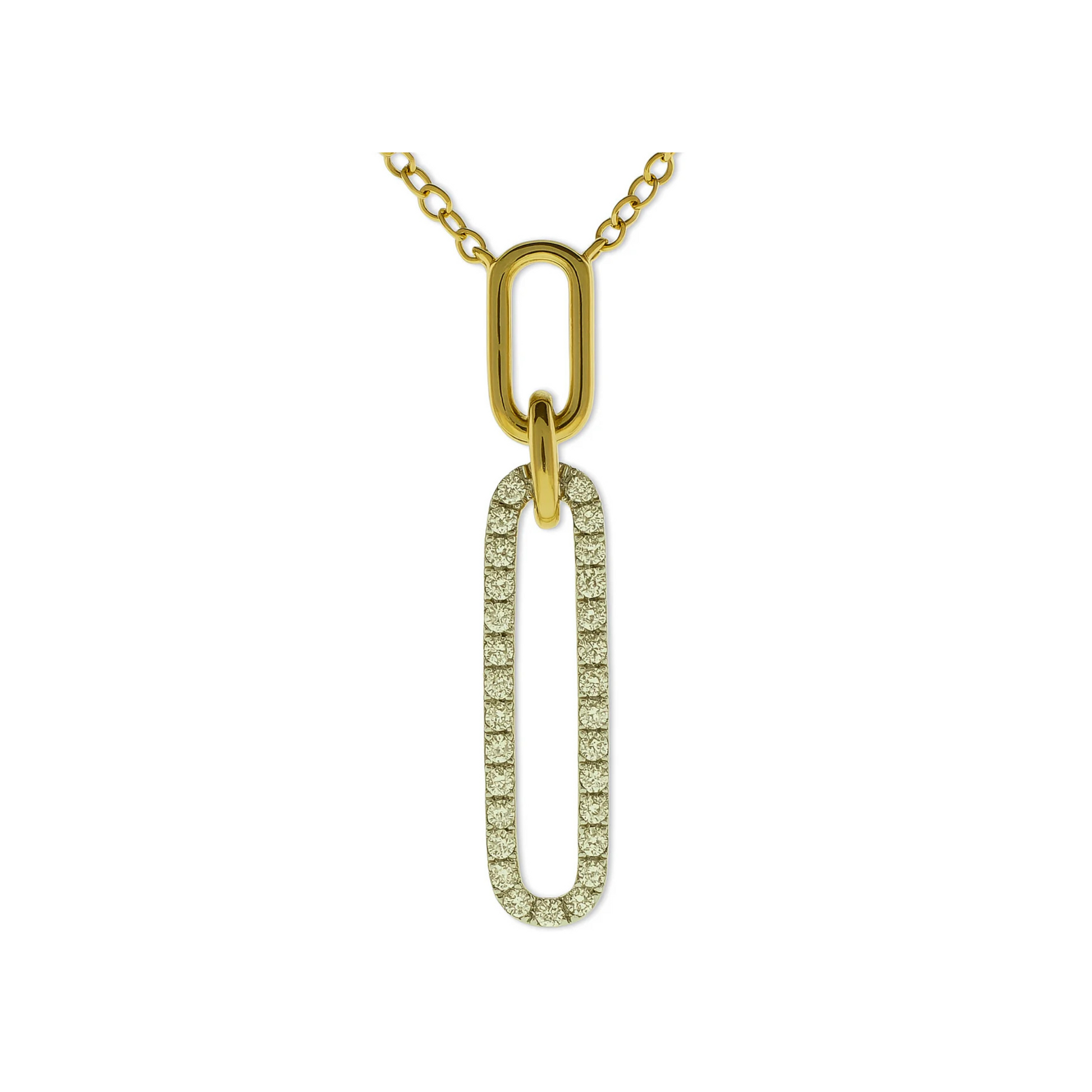 Modern elegance meets timeless sparkle in this 14K two-tone gold paperclip drop necklace. Featuring a bold open-link design, the pendant showcases a vertical paperclip-shaped charm in white gold, fully pavé-set with .19 carats of shimmering diamonds. Suspended from a contrasting yellow gold chain and connector link, this statement piece brings a chic, contemporary edge to any look. Perfect for layering or wearing solo.
