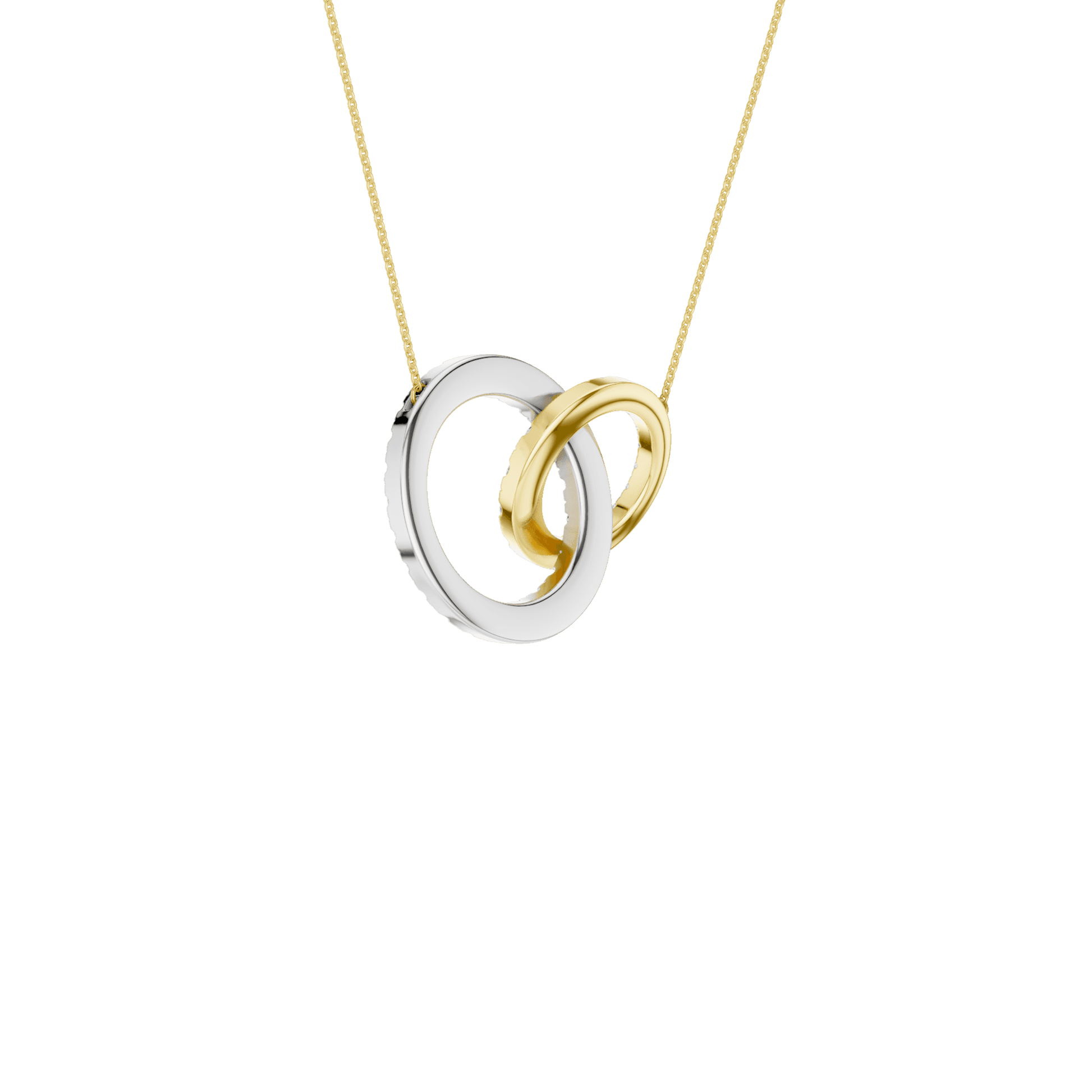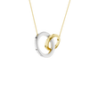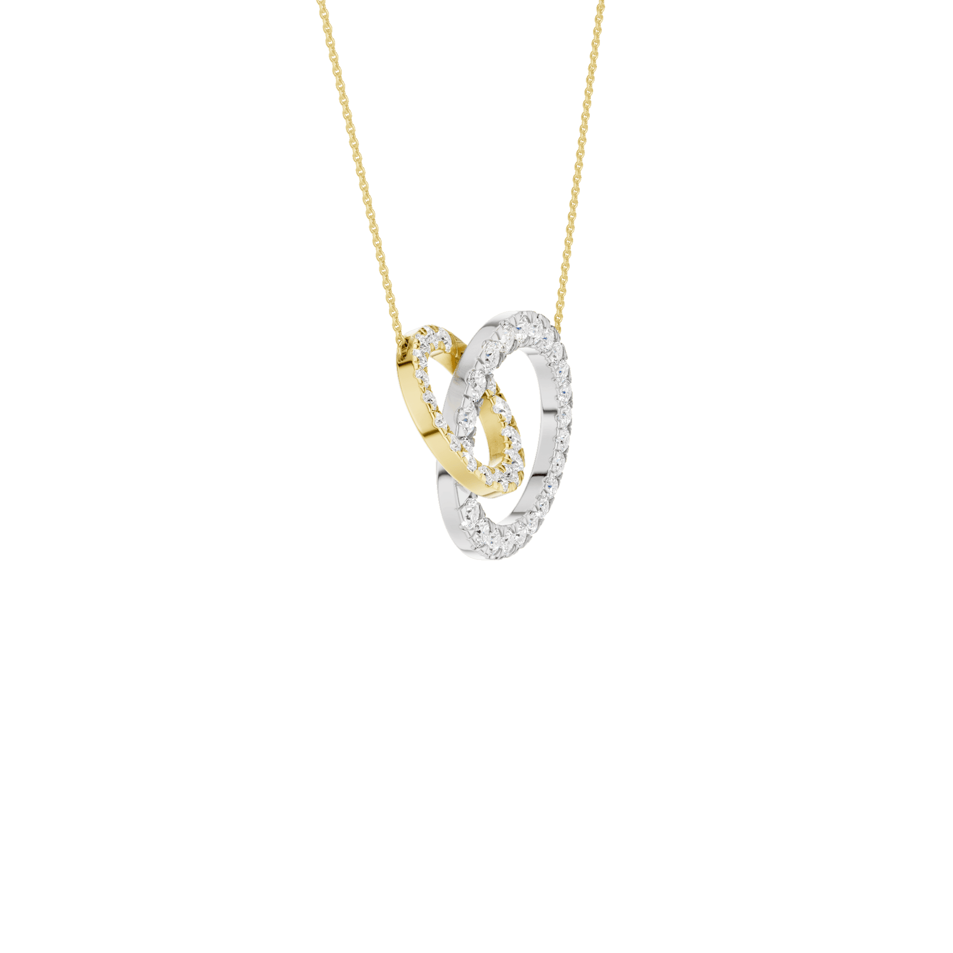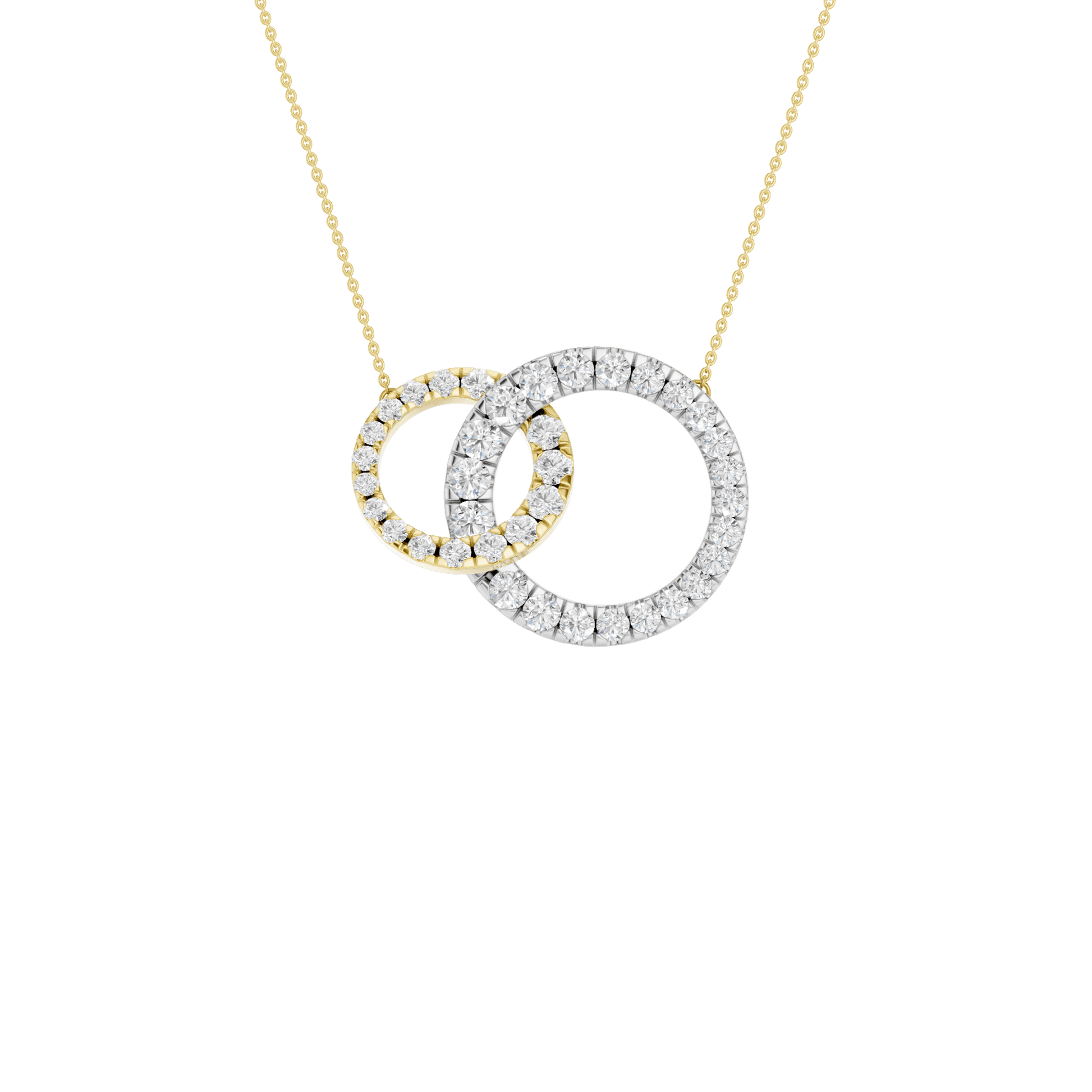 Celebrate connection and elegance with this timeless interlinked circle pendant. A 14KT yellow+white gold diamond-studded smaller circle gracefully intertwines with a larger diamond-studded circle, creating a symbol of unity and endless possibility. The diamond circles sparkle with 1.00 carat total weight of brilliant lab grown round diamonds, offering sustainable luxury and exceptional radiance. Suspended from a delicate chain, this pendant is perfect for layering or wearing solo for effortless sophistication.