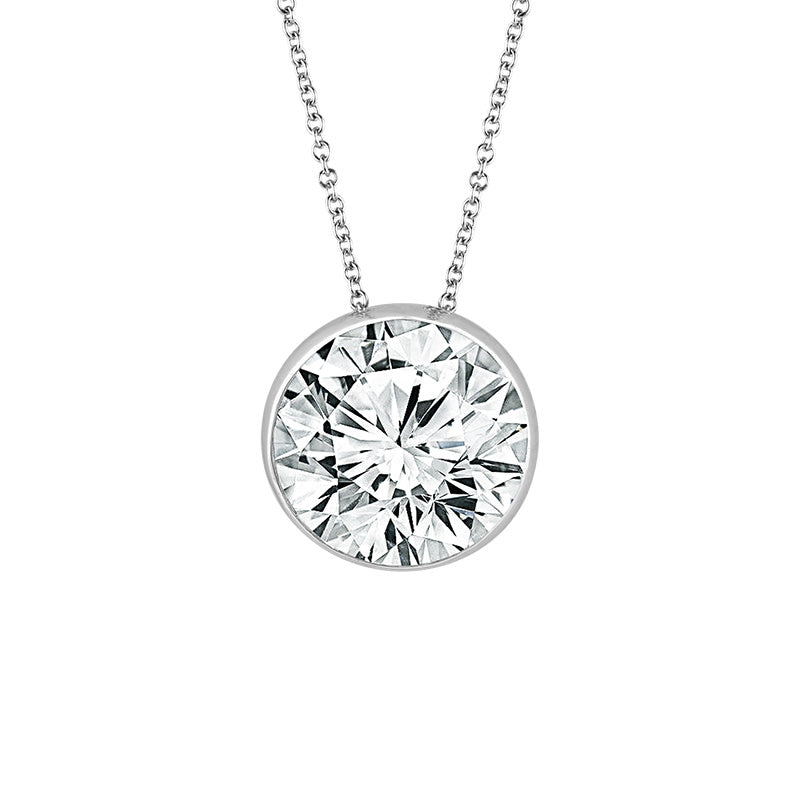 This 16-18" easy-to-layer, round diamond pendant totaling 1/2 carat, drapes beautifully around the neck. This beauty is designed to showcase the entire diamond in our innovative Skysetting.