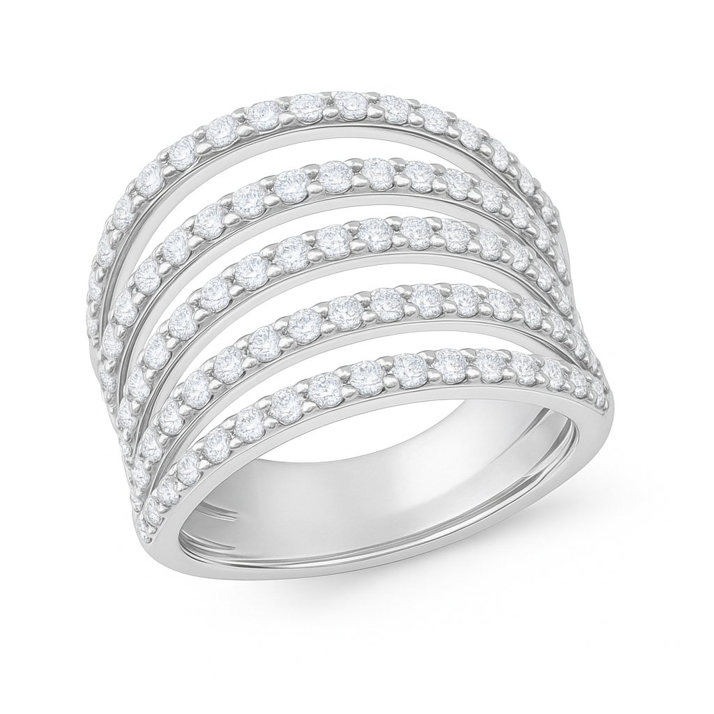 Bold, brilliant, and beautifully modern, this 14KT white gold fashion band features five dazzling rows of pavé-set round diamonds totaling 1.40 carats. Each row curves gracefully across the finger, creating a stunning spread of sparkle with a multidimensional, sculpted look. Crafted in bright white gold for a sleek, mirror-like finish, this wide-band design offers the perfect balance of everyday elegance and statement-making shine. Wear it as a stand-alone showstopper or pair it with your favorite stack for an elevated, luxe look.