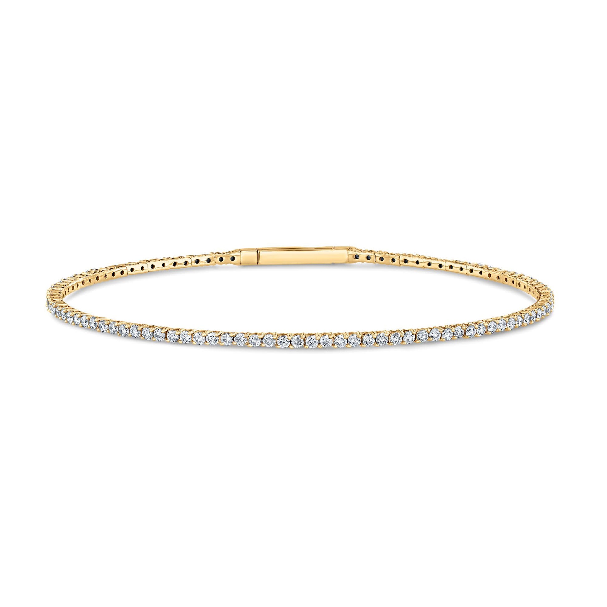 This dazzling diamond bangle is crafted in 14kt white gold and offers ultimate comfort with its flex technology. Round diamonds total 1.00ctw and are prong set to sparkle endlessly half way around the bracelet.