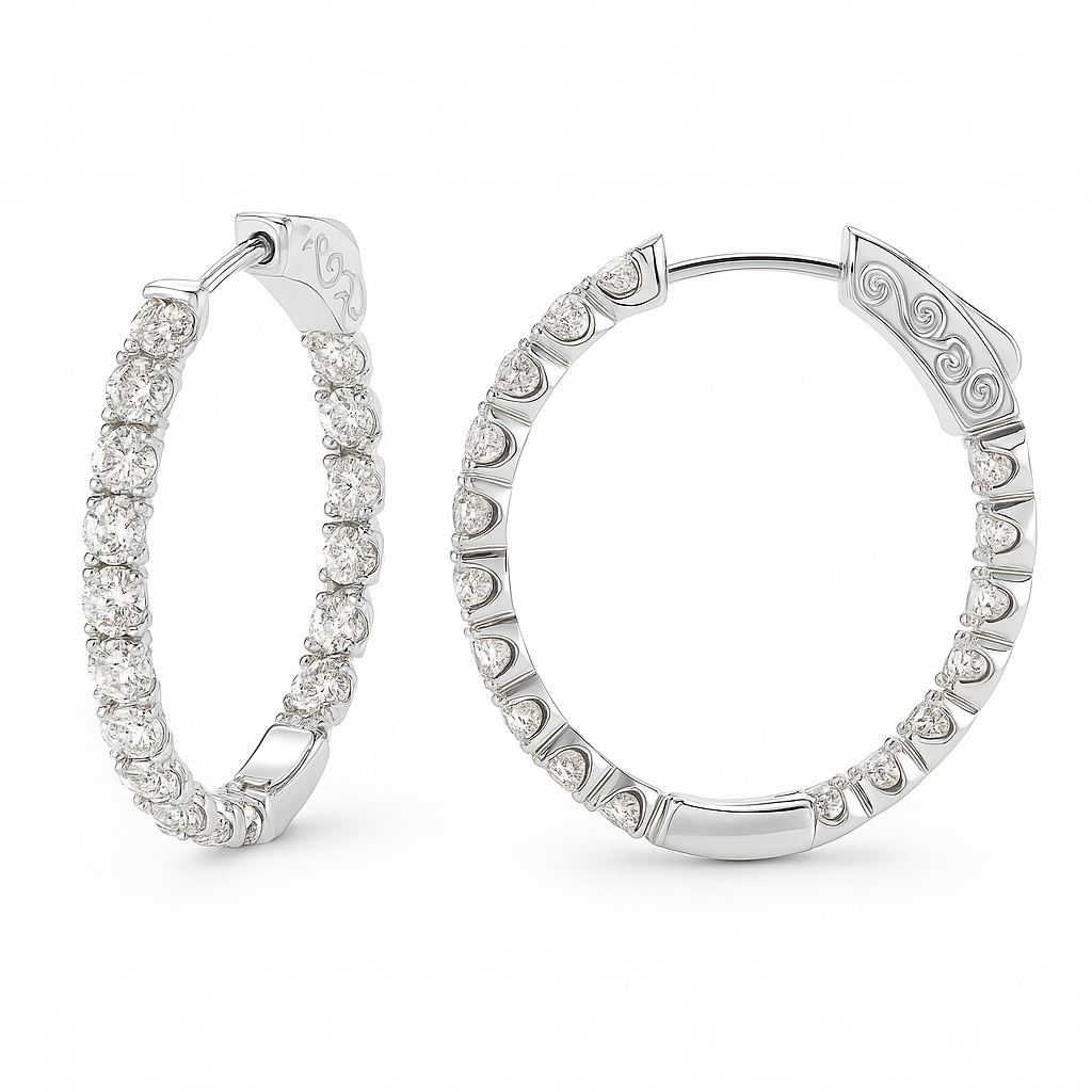 Add timeless brilliance to your jewelry collection with these breathtaking 2.00 carat total weight diamond hoop earrings. Crafted in luminous 14K white gold, each round-shaped hoop features an inside-out design—showcasing dazzling diamonds on both the outer front and inner back for maximum sparkle from every angle.