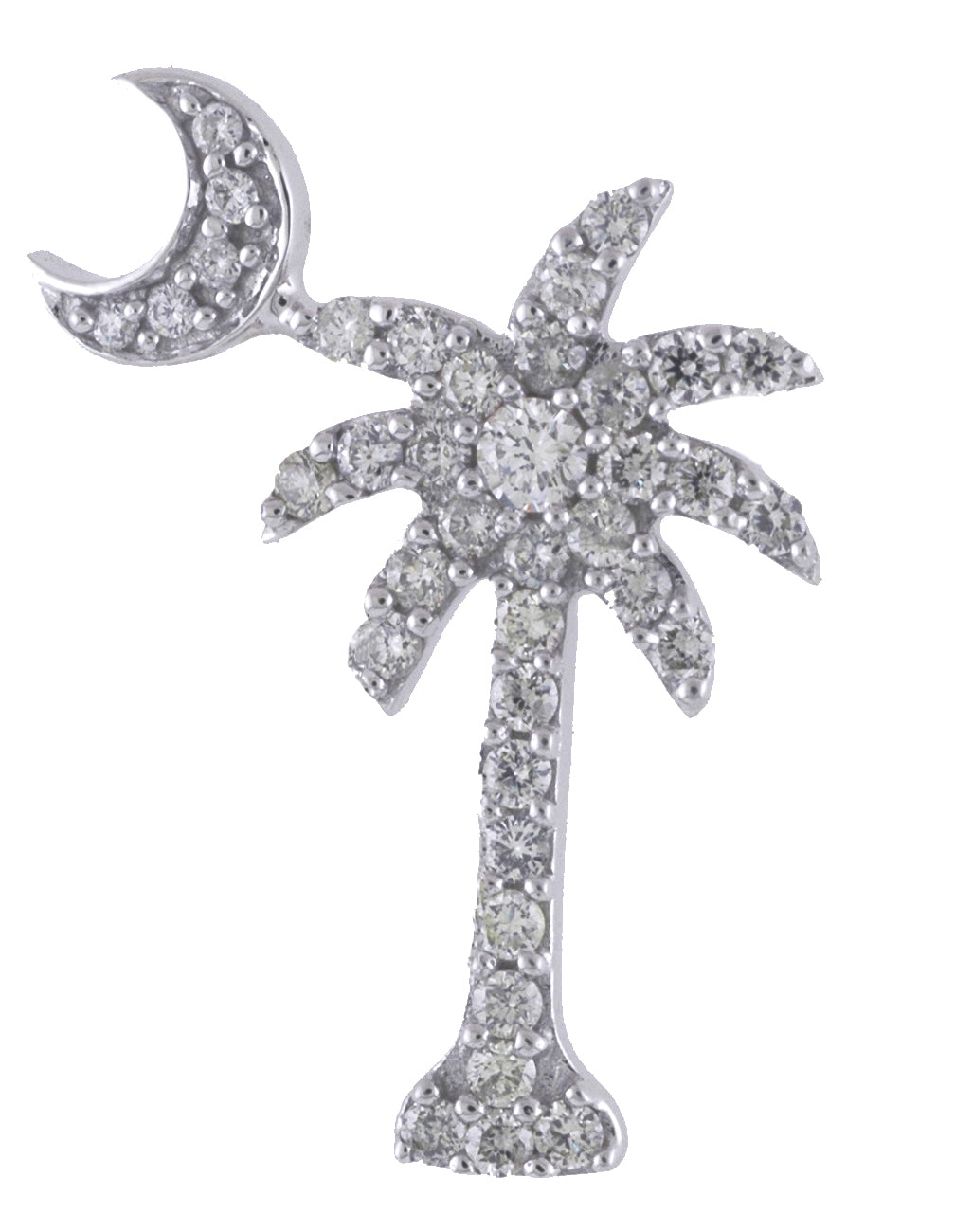 Inspired by lowcountry living, the South Carolina Palmetto and Crescent Moon diamond pendant is a must have! Crafted in 14k white gold, it showcases beautiful round brilliant cut diamonds that are perfectly set to shimmer. Total diamond weight is 0.53ctw. Necklace is complete with an 18", 14kt, beautiful white gold chain.
