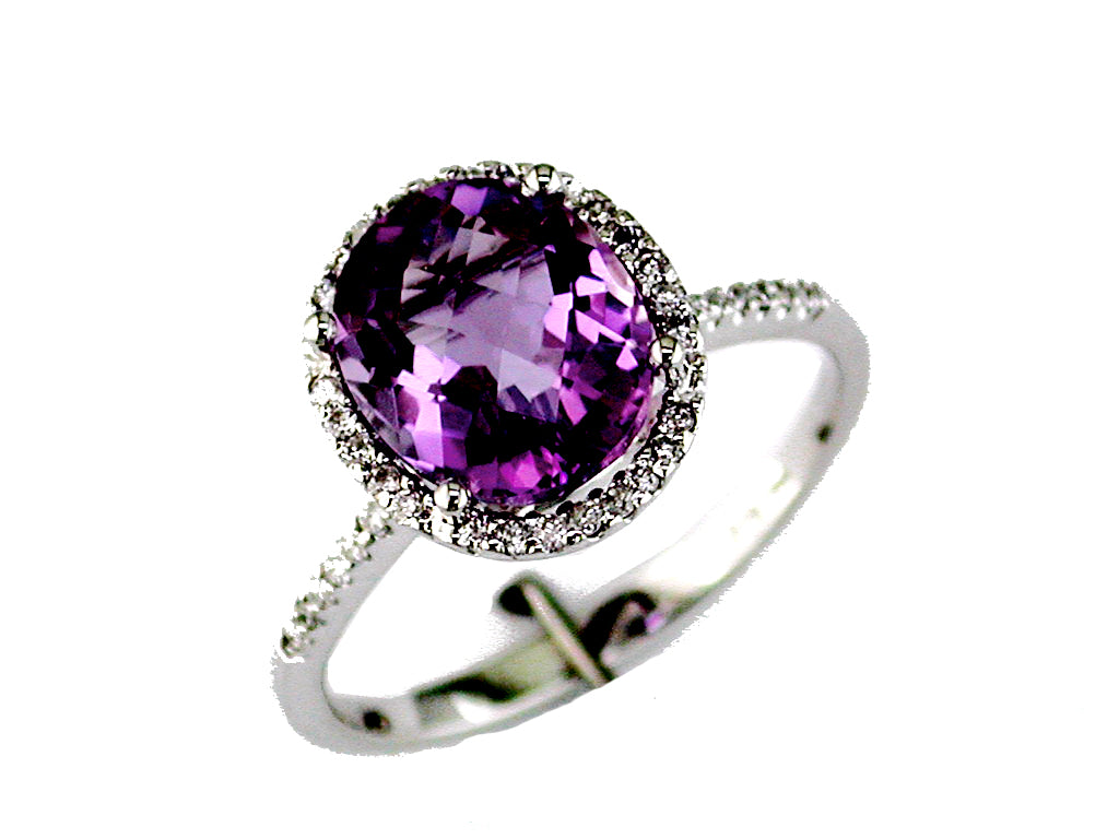 This stunning February birthstone ring is the perfect addition to any gemstone lovers collection! Shimmering diamonds wrap around this central oval cut amethyst gemstone (2.40ct), providing eye-catching brilliance.