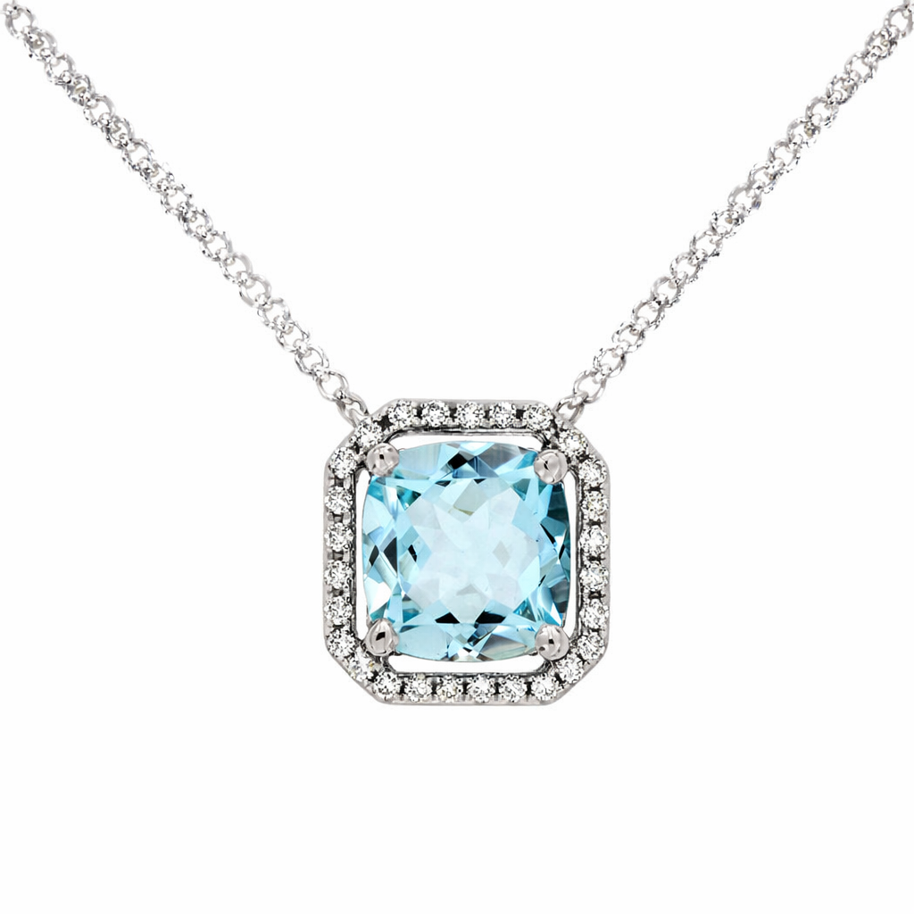 14K White Gold Cushion Cut Aquamarine & Diamond Halo Necklace
