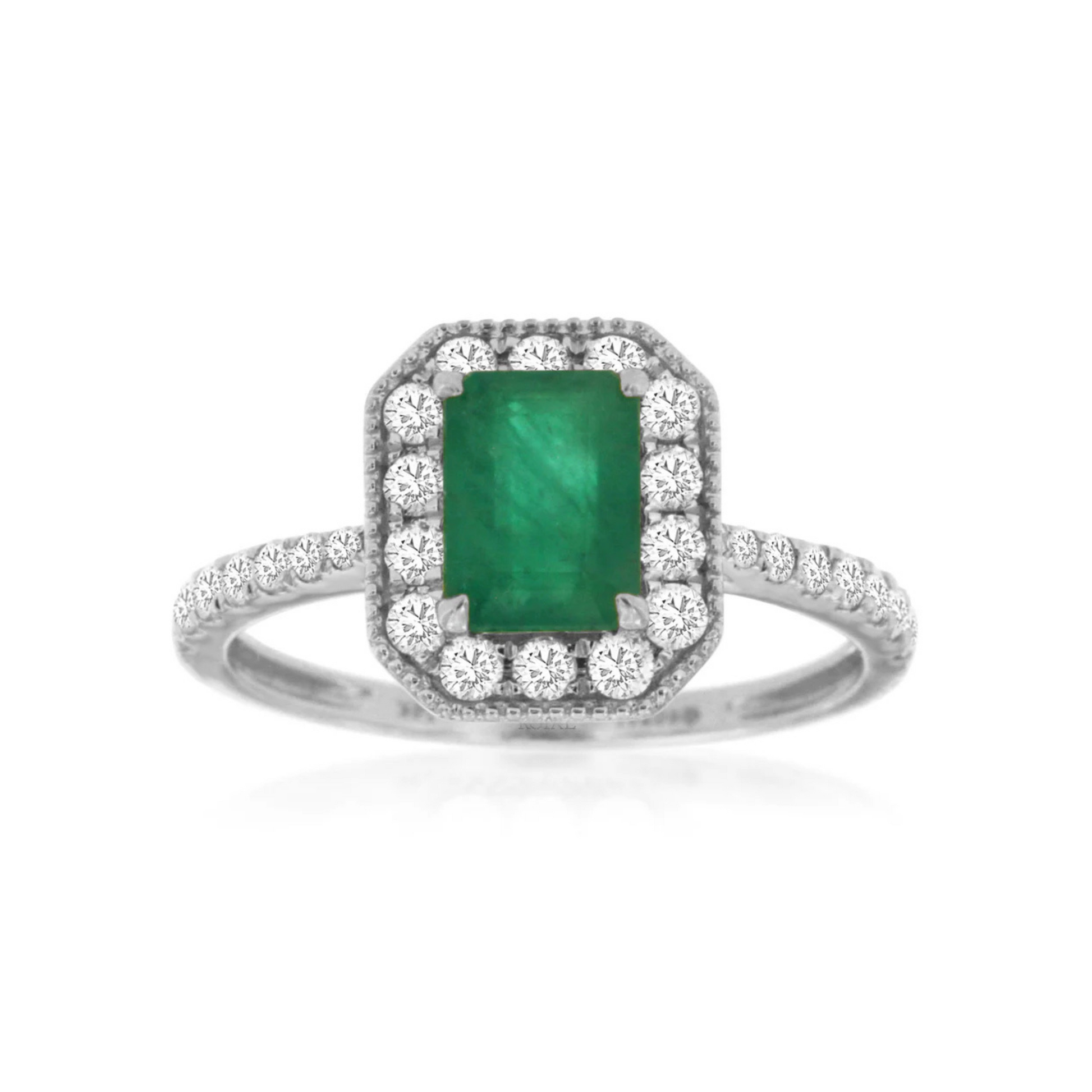 A vibrant emerald cut emerald (1.00ct) garnishes this classic May birthstone ring. Nestled within a halo of dazzling pave diamonds, it lends a pretty pop of color and dash of sparkle to any ensemble. Total diamond weight of the ring is 0.50ctw.