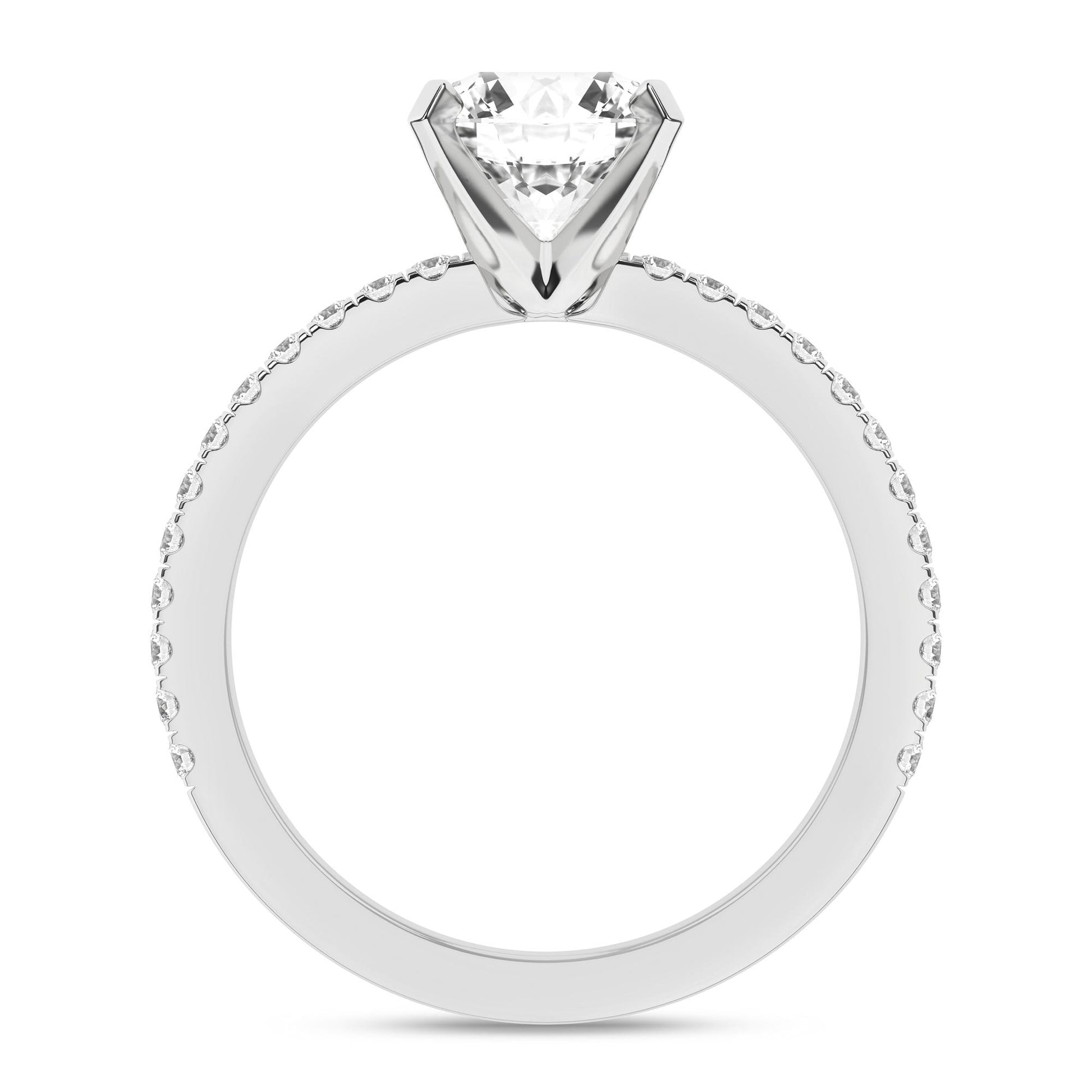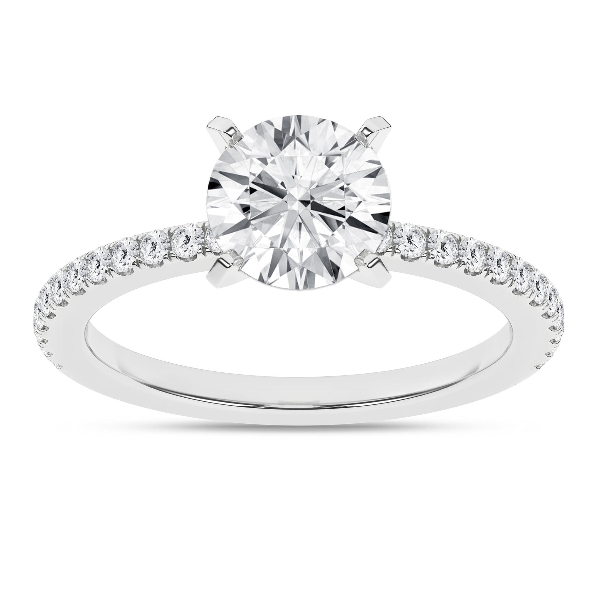 Embrace classic elegance with our Round Lab-Created Diamond Straight Shank Engagement Ring, set in 14KT white gold and studded with 1.83ctw of diamonds in a timeless four-prong setting. The center stone, a stunning round-cut 1.54 ct revelation diamond, takes center stage. Each diamond in this exquisite ring is certified by IGI for authenticity and quality assurance, boasting EF color and VS clarity. This ring epitomizes enduring beauty and craftsmanship, making it the perfect symbol of your love and commitment.