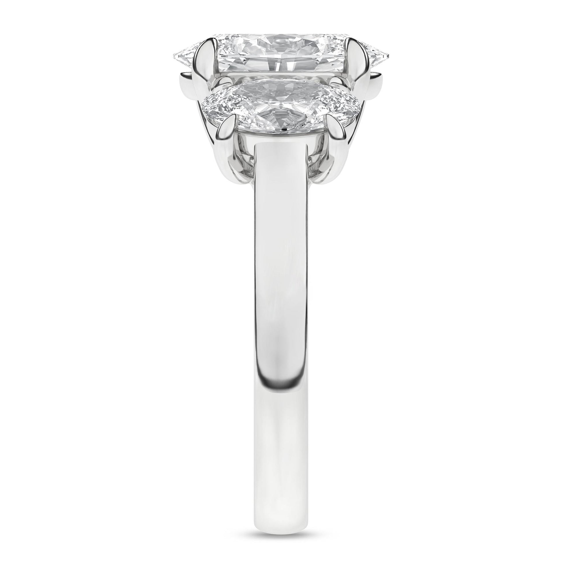 Experience the allure of our alluring oval lab-created Diamond Ring, a true masterpiece featuring three brilliant oval-cut diamonds seamlessly set in a row, creating a harmonious display of radiant beauty in 14KT white gold. This exquisite ring is studded with 5.0 carat total weight of diamonds, each one certified by IGI for authenticity and quality assurance. The center oval-cut stone is a dazzling 3.0 ct, while the sides boast equally stunning 2 carats total diamonds. With EF color diamonds and VS clarity, this ring sparkles with unmatched brilliance, making it a remarkable symbol of your enduring love and commitment.