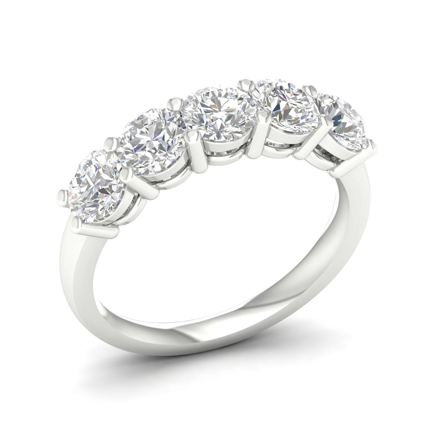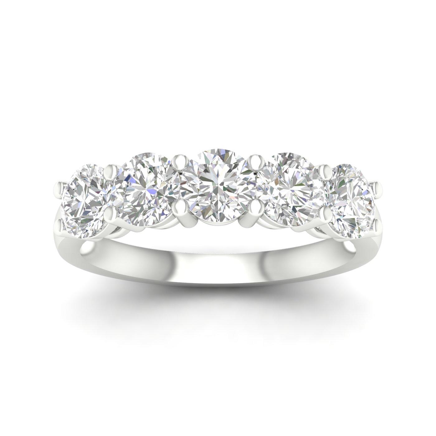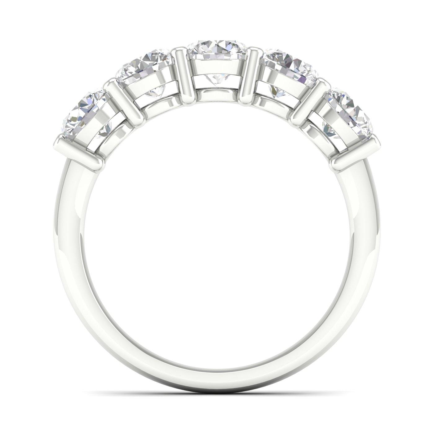 The brilliant round Lab Grown diamond 5-stone band, certified by IGI for quality assurance, is set in 14KT white gold and studded with 2 ctw of diamonds in a timeless four-prong setting. Each round brilliant-cut Revelation diamond, weighing 3/8 ct., exhibits GH color and VS clarity. This combination of exquisite diamonds and meticulous craftsmanship creates a truly remarkable piece that radiates elegance and sophistication.