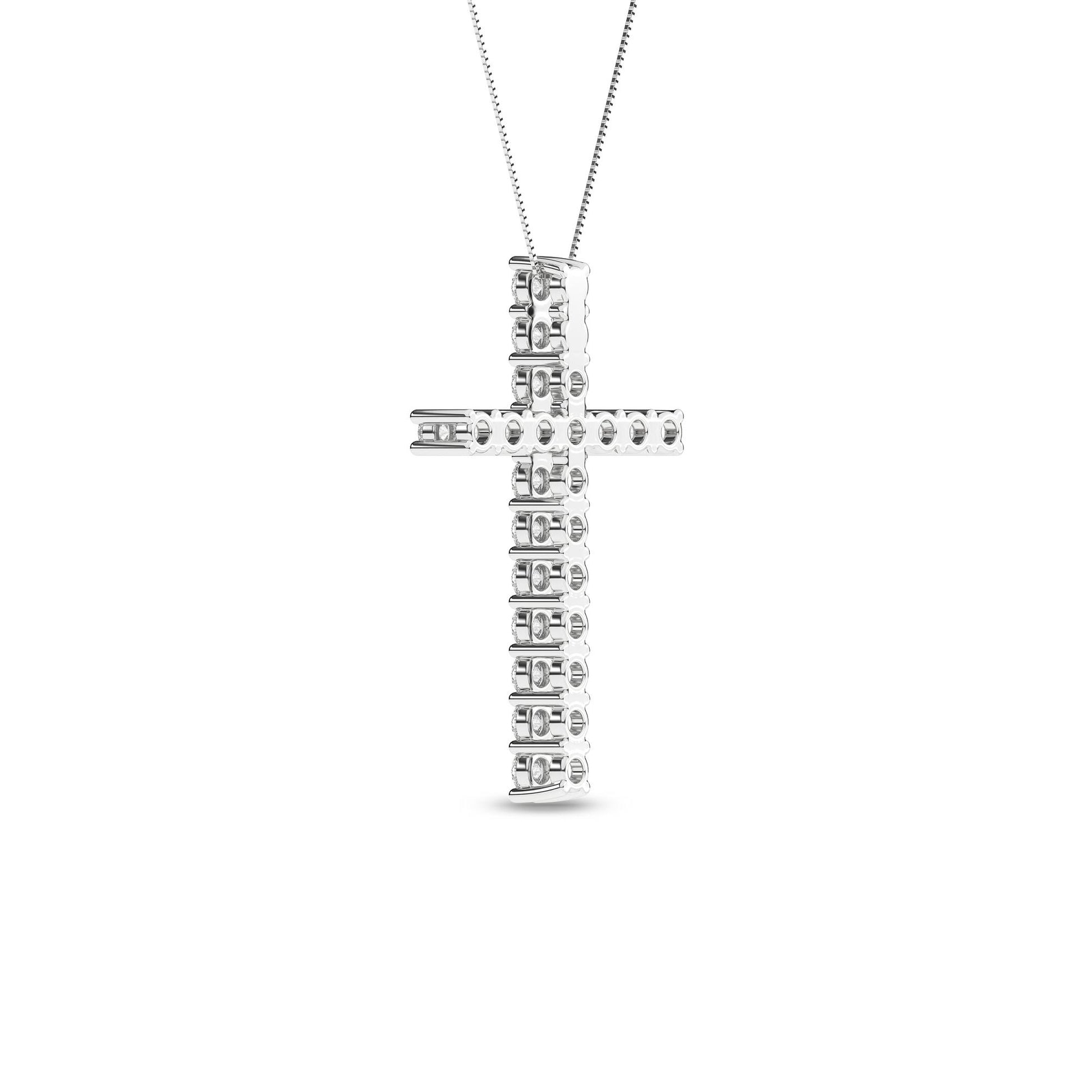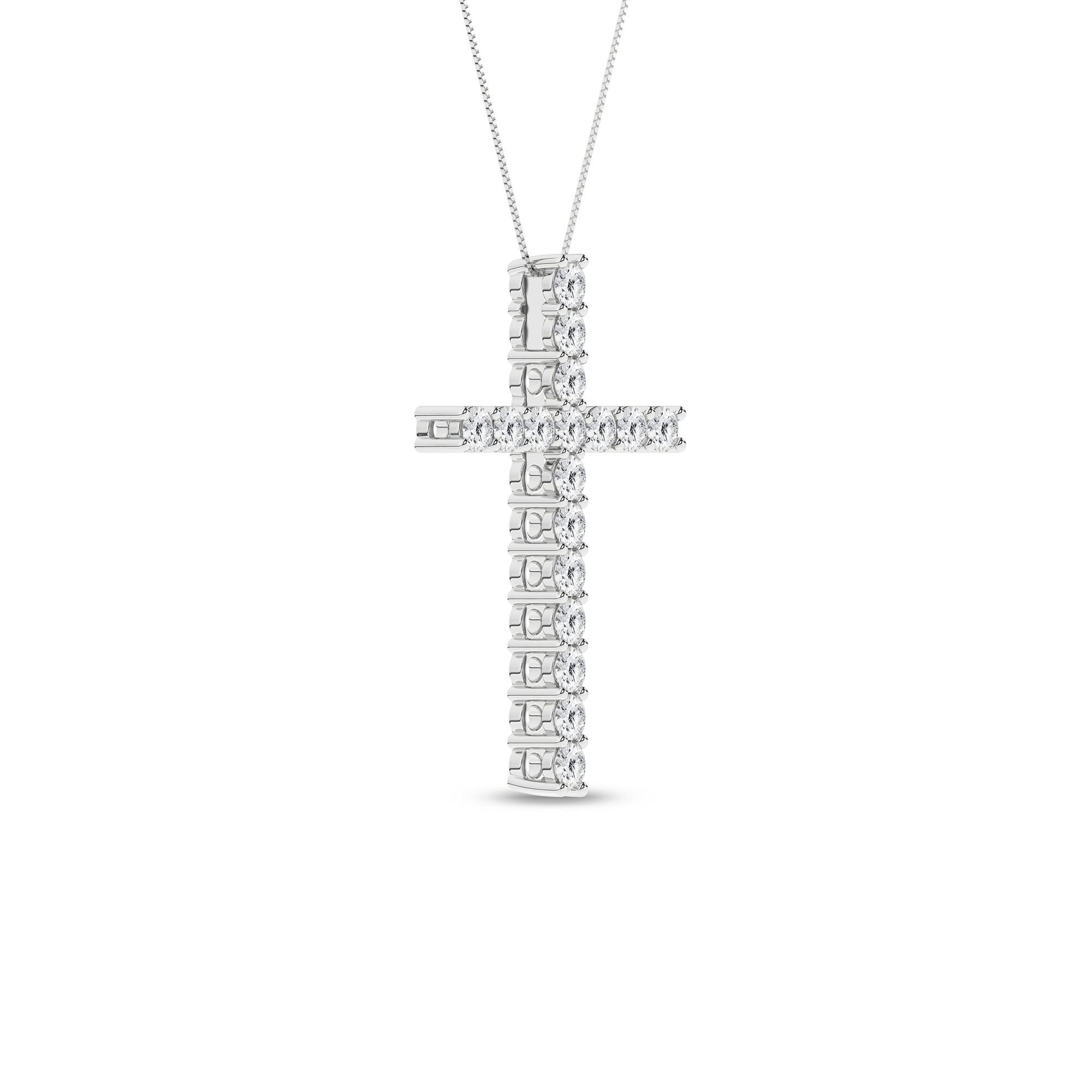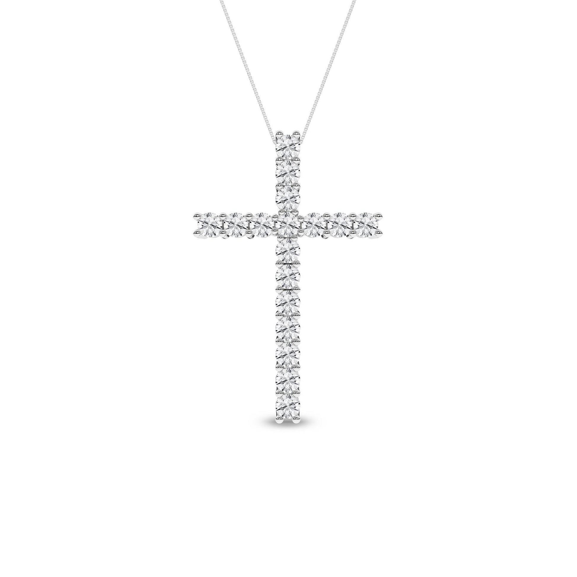 Classic round Lab Grown diamond cross pendant set in 14KT white gold, embellished with 1 ctw of EF color and VS clarity diamonds. This elegant pendant is securely fastened to a box chain with a spring ring lock. Notably, the diamonds featured in this piece are certified by IGI, confirming their EF color, VS clarity, and exceptional quality.
