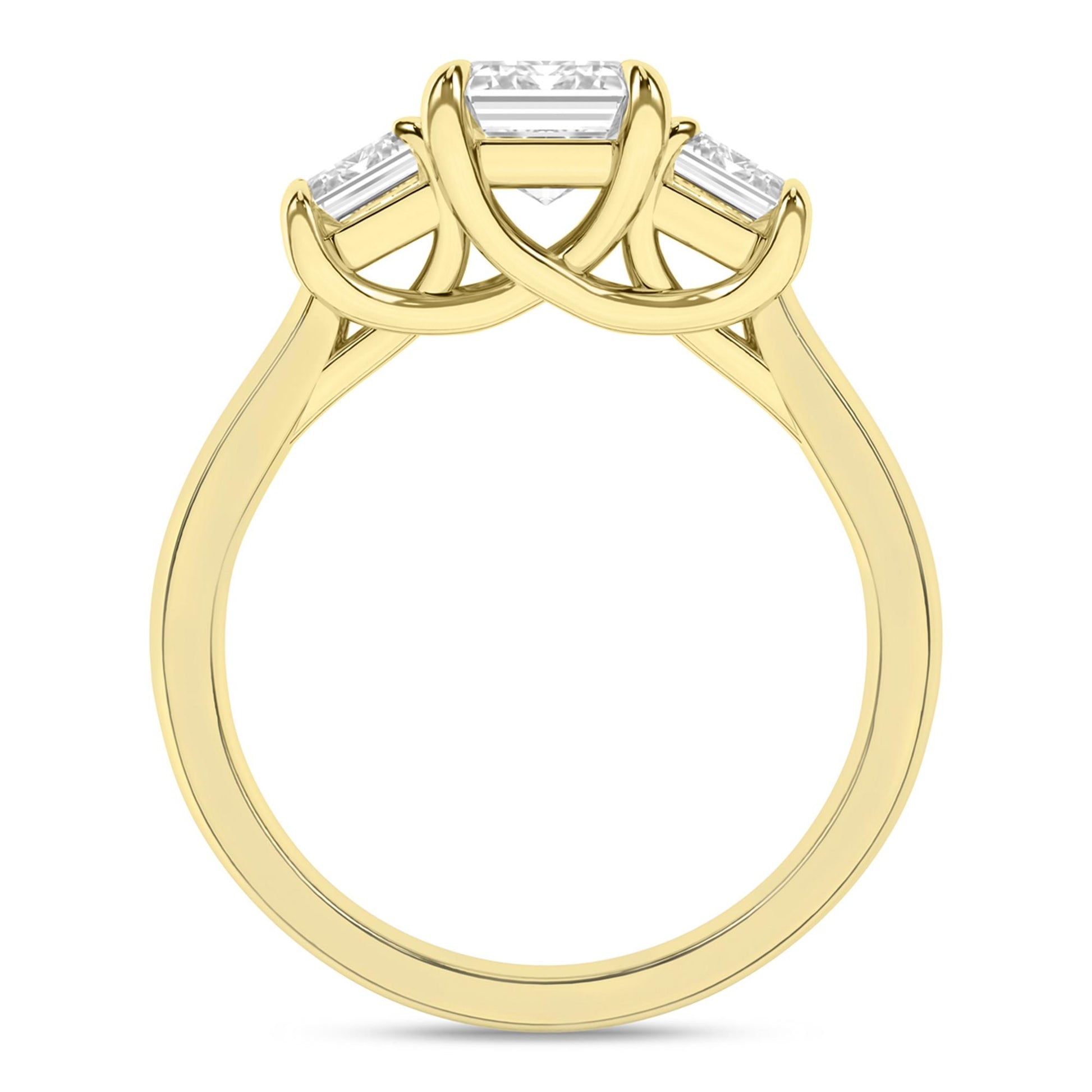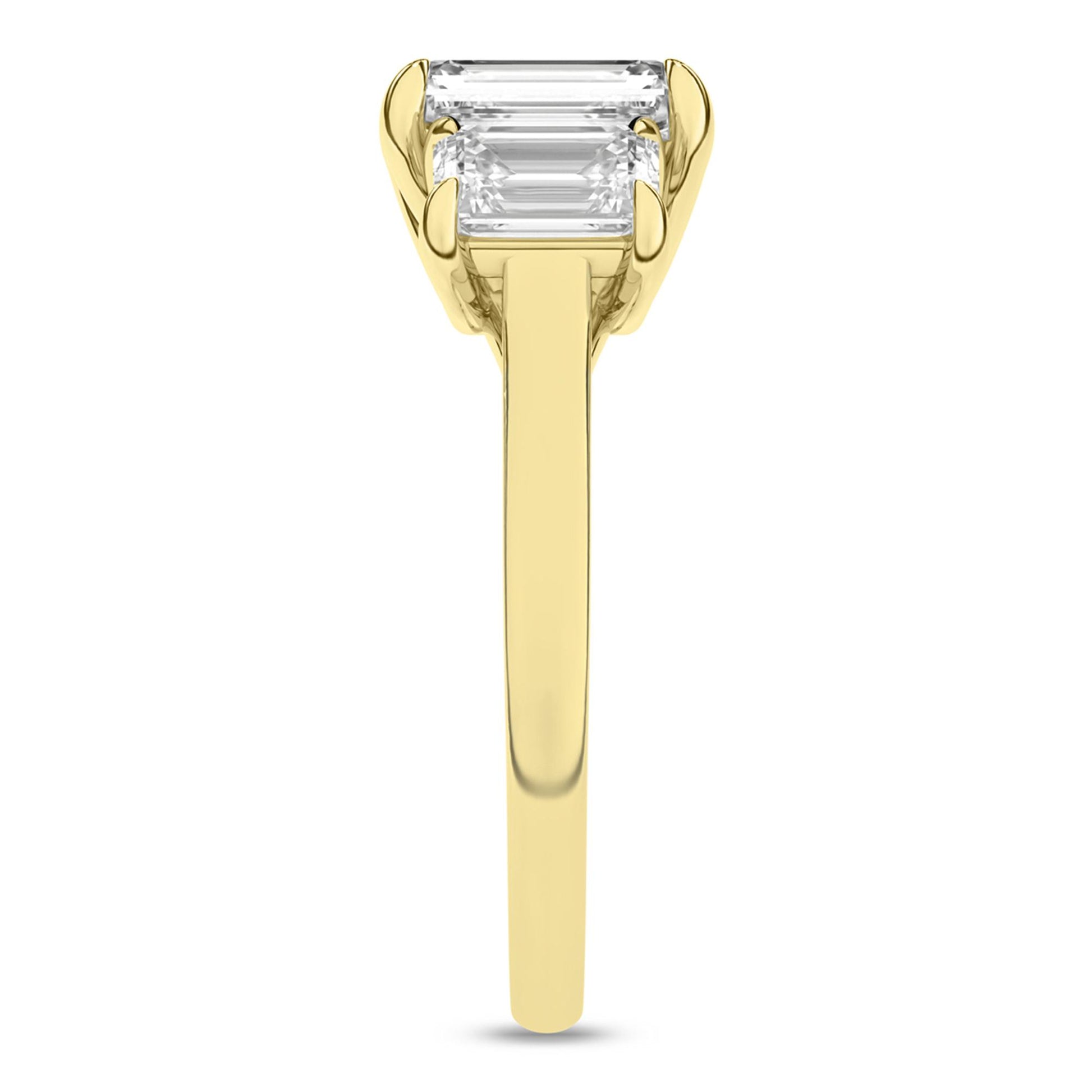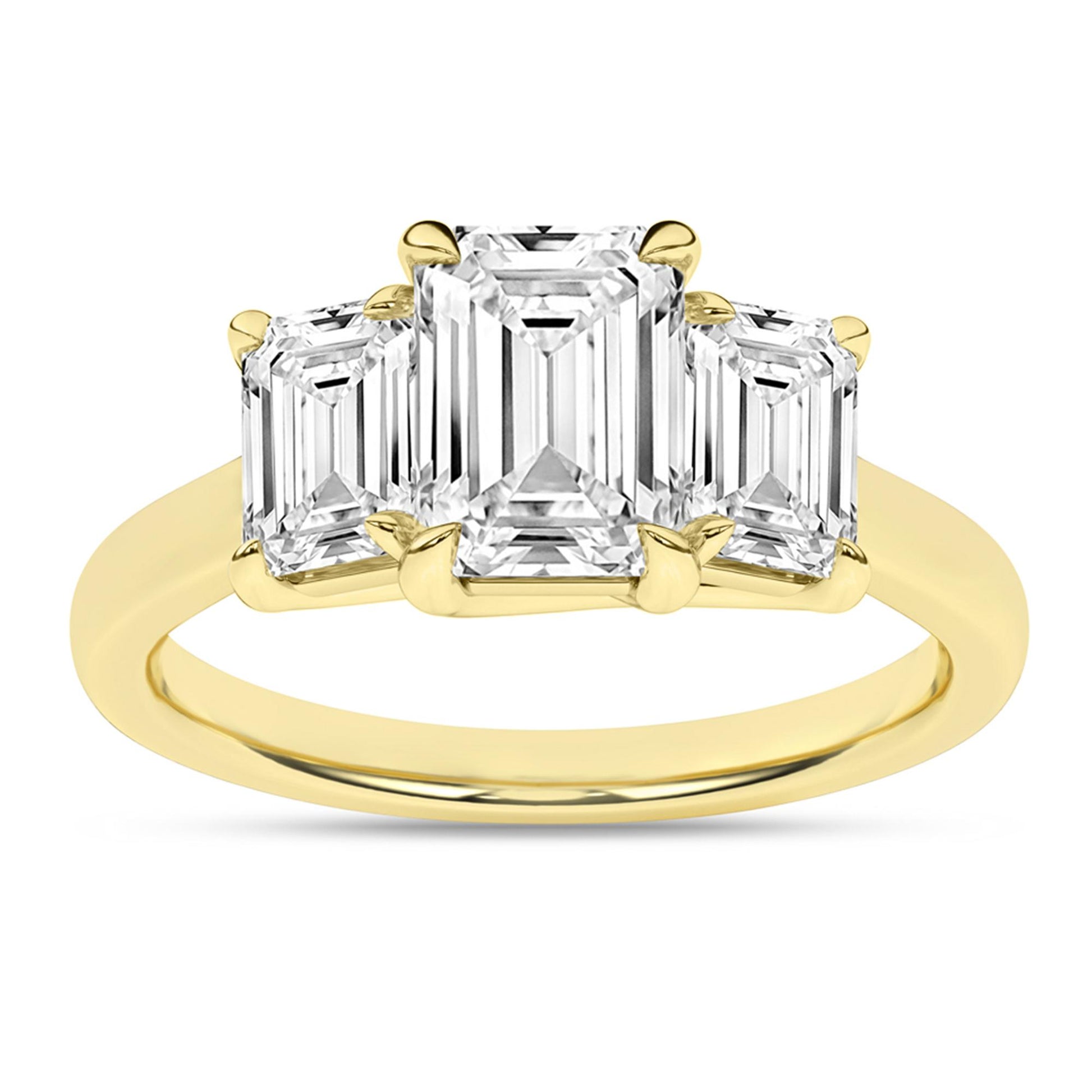 Discover the timeless elegance of our Emerald Lab-Created Diamond Ring, a masterpiece featuring three magnificent emerald-cut diamonds seamlessly set in a row, creating a harmonious display of radiant beauty in 14KT yellow gold. This exquisite ring is studded with 3.0 ctw of diamonds, each one certified by IGI for authenticity and quality assurance. The center emerald-cut stone is a dazzling 1.50 ct, while the sides boast equally stunning 3/4 ct diamonds. With E/F color diamonds and VS clarity, this ring sparkles with unmatched brilliance, making it a remarkable symbol of your enduring love and commitment.