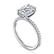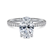 Classic elegance with a refined sparkle—this 14K white gold engagement ring setting is designed to perfectly showcase an oval center stone of your choice. Featuring .19 carats total weight of pavé-set diamonds shimmering halfway down the shank, the design offers just the right amount of brilliance while maintaining a timeless silhouette.