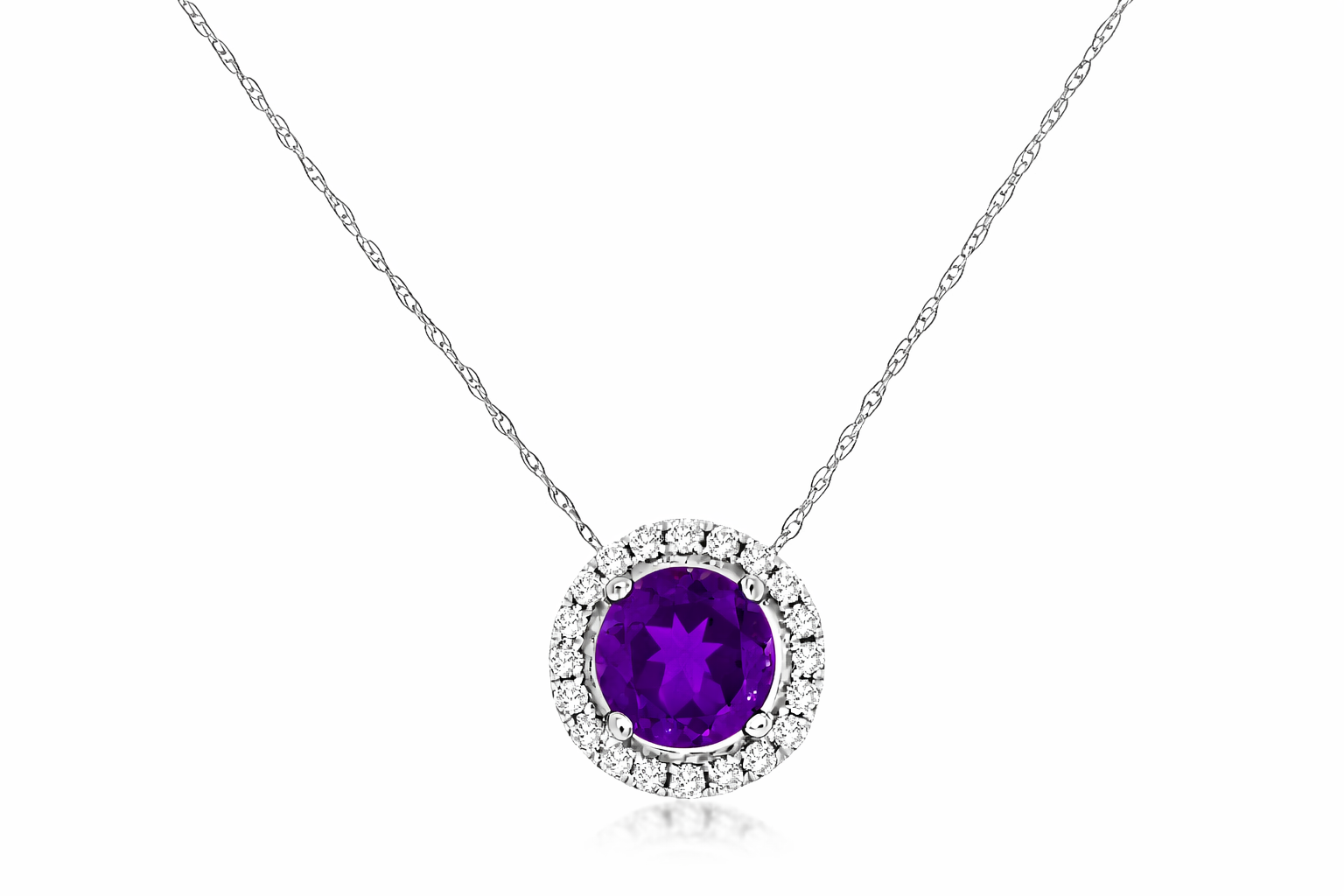 Elegant and timeless, this necklace features a vibrant round amethyst weighing .60 carats, surrounded by a delicate halo of shimmering pavé-set diamonds. The rich purple hue of the amethyst is beautifully enhanced by the brilliance of .08 carats total weight of diamonds, creating a classic and eye-catching design. Crafted in 14KT white gold and suspended from a fine chain, this piece offers effortless sophistication, perfect for everyday wear or adding a touch of color to special occasions. A meaningful gift for a February birthday, anniversary, or milestone, this amethyst and diamond necklace is a piece to be treasured for years to come.