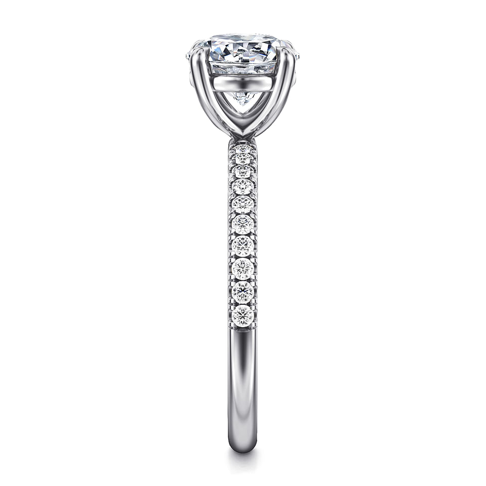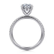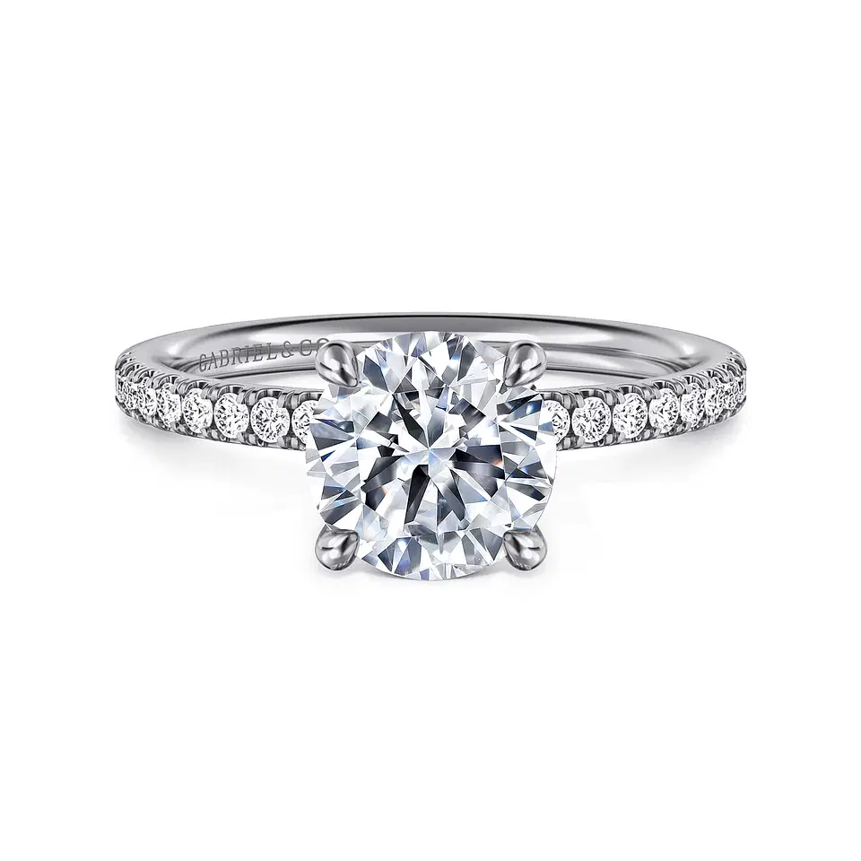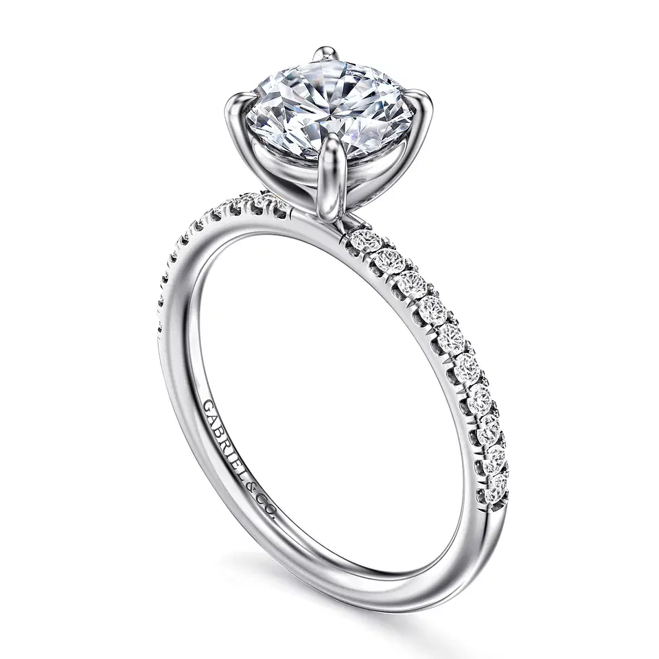 This elegant 14K white gold engagement ring semi-mount is designed to beautifully showcase a 7.4mm round center stone (not included). Featuring sparkling round diamonds totaling .20 CTW set gracefully down the shank, this setting adds a brilliant shimmer from every angle. Perfect for customizing your ideal engagement ring, the semi-mount offers a timeless and sophisticated foundation to highlight your chosen center diamond.