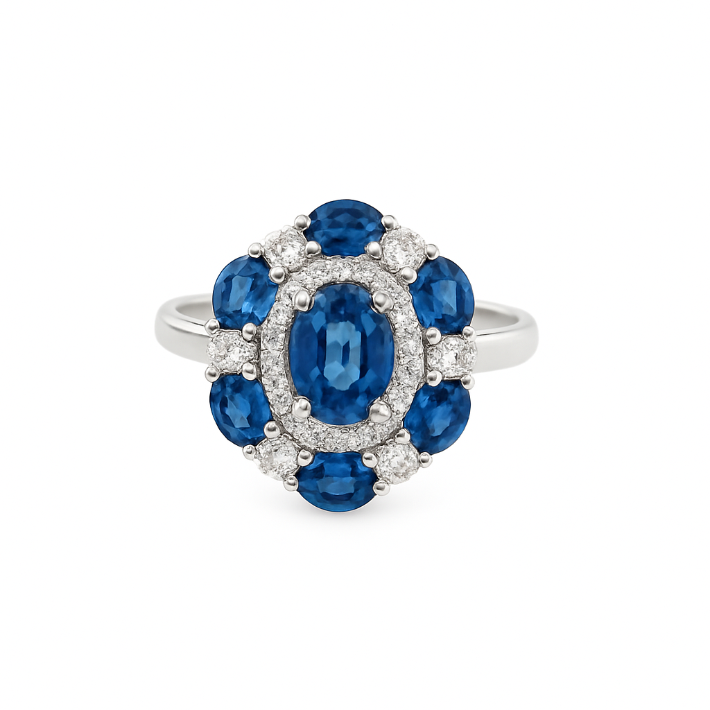 A vibrant oval cut sapphire garnishes this classic September birthstone ring. Nestled within a halo of dazzling pave diamonds, it lends a pretty pop of color and dash of sparkle to any ensemble.