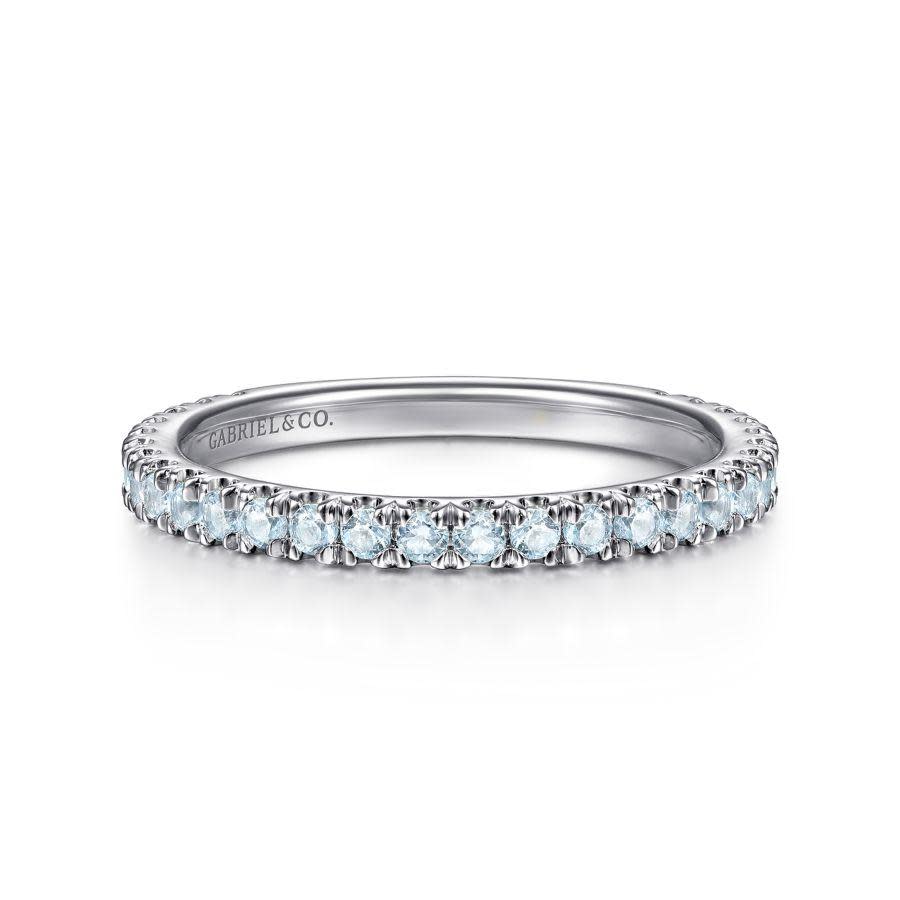 A timeless stackable ring with a sleek straight silhouette and dozens of vivid sky blue topaz gemstones. Crafted from luxe 14K white gold, this December birthstone ring effuses any ensemble with a pop of bright blue color.