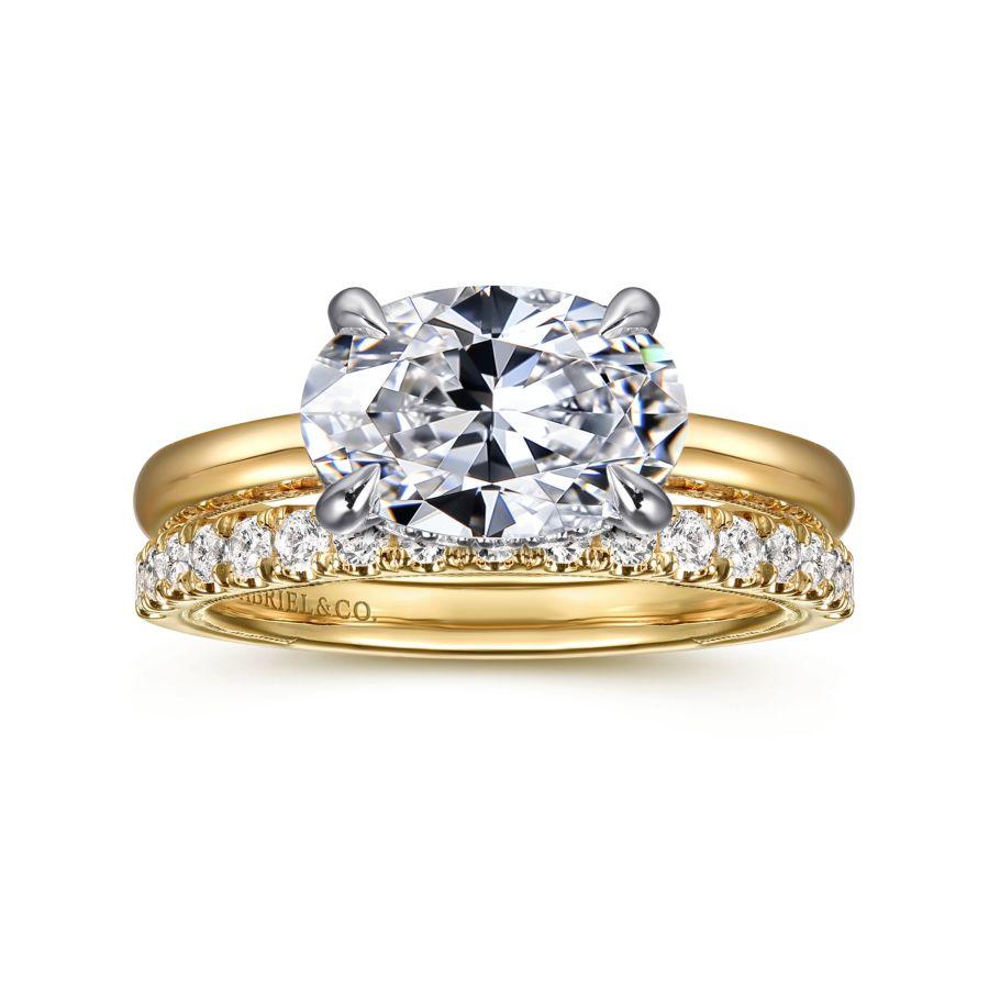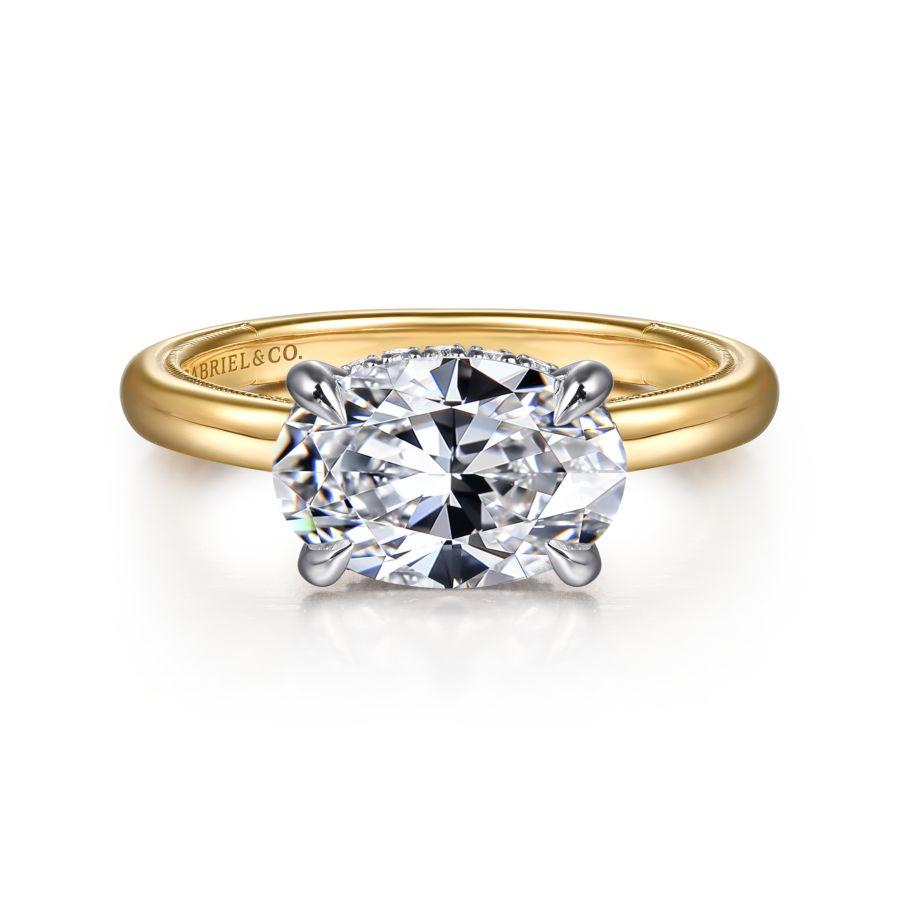 The centerpiece of this 14K white/yellow gold engagement ring features a captivating east-west, 2 ct oval-cut diamond, adorned with a hidden halo that imparts an air of mystique and brilliance. As the eye gracefully explores the minimal polished shank, delicate milgrain detailing along the inner side adds a subtle vintage charm, elevating this ring into a wearable masterpiece. Crafted in the exquisite blend of 14K white and yellow gold, this engagement ring is more than a symbol of love.