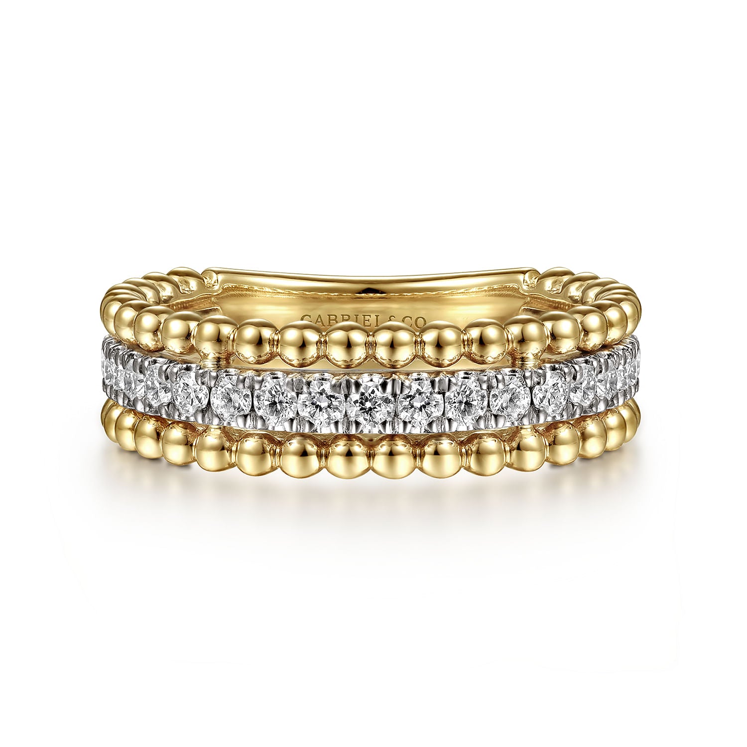 Striking contrast and elegant texture define this 14K white and yellow gold three row diamond and Bujukan bead ring. Expertly crafted, this distinctive design features two rows of signature Bujukan beads in rich yellow gold, framing a brilliant center row of diamonds set in white gold for added dimension and sparkle.