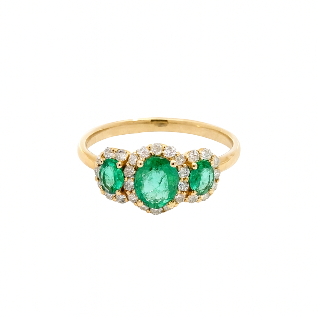 A stunning symbol of elegance, this 14k yellow gold ring showcases a vibrant emerald at its center, flanked by two brilliant diamonds on either side. The striking green of the emerald contrasts beautifully with the diamonds' sparkle, creating a timeless and sophisticated look. The three-stone design represents love, balance, and harmony, making it a perfect choice for special occasions or as a statement piece. This exquisite ring captures the essence of luxury and natural beauty.