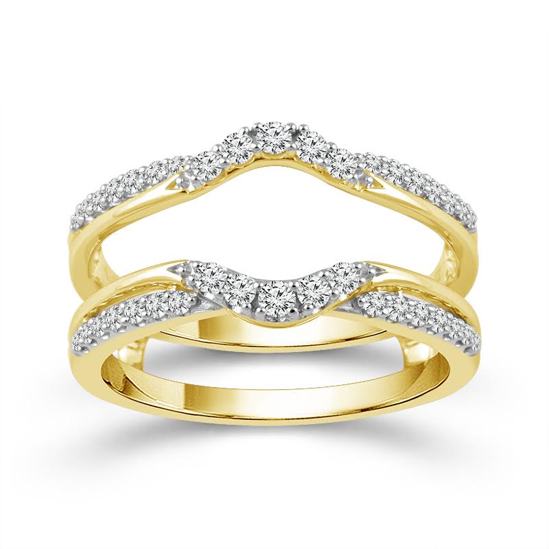 Enhance your engagement or solitaire ring with the shimmering elegance of this 14K yellow gold ring guard, featuring an intertwined design that symbolizes unity and everlasting love. Adorned with 1/3 carat total weight of pavé-set diamonds, this guard wraps your center ring in dazzling brilliance from both sides. The delicate crossover pattern adds dimension and sparkle, creating a seamless, sophisticated look. Perfect for adding a touch of luxury and meaning to your bridal set or as a stunning anniversary upgrade.