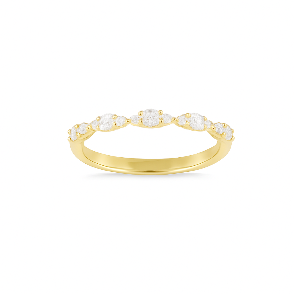 Add timeless elegance to your stack with this 14K yellow gold diamond band. Featuring .31 carats total weight of brilliant round diamonds, this delicate band showcases a unique alternating pattern for eye-catching sparkle from every angle. Crafted in rich yellow gold, it’s the perfect piece to wear alone, pair with your engagement ring, or stack with other bands for a personalized look. Ideal for anniversaries, weddings, or everyday luxury.