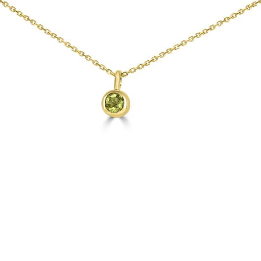 This elegant 14K Yellow Gold 4MM Bezel Peridot Necklace features a stunning round peridot gemstone, securely set in a sleek bezel setting. The vibrant green hue of the peridot is beautifully complemented by the warm glow of the 14K yellow gold, creating a sophisticated and timeless piece. The necklace is finished with an 18-inch gold chain, offering a perfect length for everyday wear or special occasions. Whether you're treating yourself or gifting a loved one, this necklace adds a touch of natural beauty and elegance to any outfit.