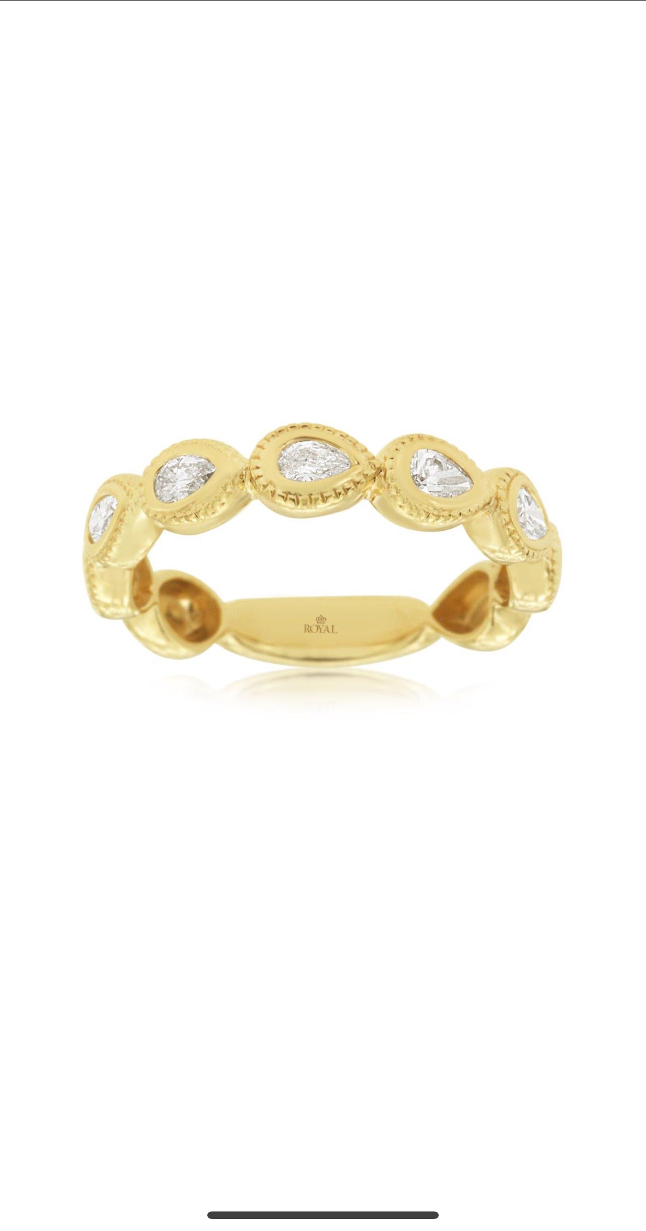 Exquisite and timeless, the 14K Yellow Gold 5 Stone Pear Diamond Band adds a touch of sophistication to any collection. Featuring five stunning pear-shaped diamonds, each set in intricate milgrain bezels, this band exudes both elegance and vintage charm. The rich yellow gold complements the diamonds' radiant sparkle, while the milgrain detailing around each bezel adds a delicate, antique-inspired finish. Whether worn as an engagement ring, wedding band, or a statement piece, this band is perfect for those seeking a blend of modern and classic styles.
