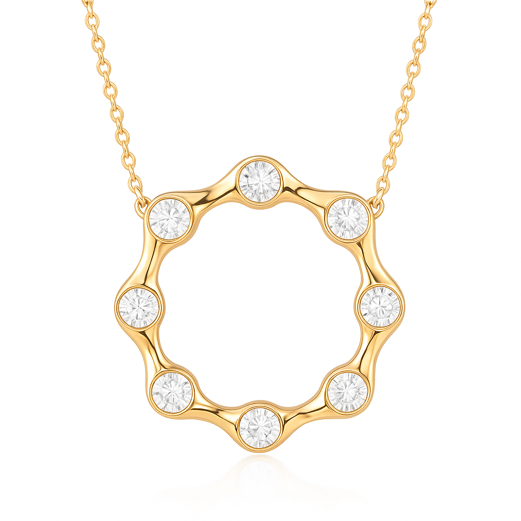 Modern elegance meets timeless design in this stunning diamond circle pendant. Crafted in polished 14K yellow gold, the open circle is adorned with eight round brilliant diamonds totaling .59 carats, each bezel-set for a sleek, contemporary look. The smooth, wavy gold detailing adds a touch of movement and sophistication, while the 18-inch chain perfectly balances simplicity and sparkle. A symbol of unity and everlasting love, this pendant is perfect for layering or wearing solo—an everyday piece that shines with understated luxury.