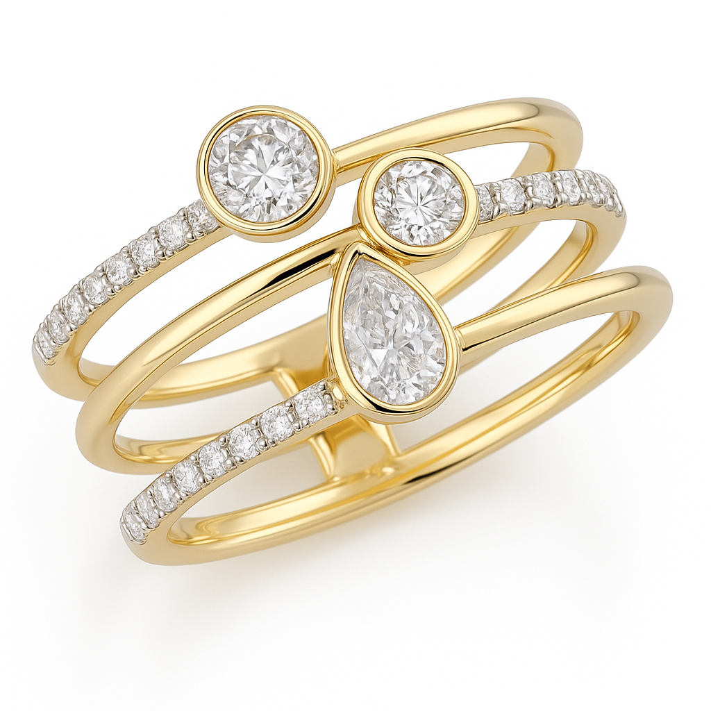 A stunning blend of modern artistry and timeless sparkle, this multi-band diamond ring features an eye-catching trio of shapes beautifully arranged across three polished 14KT yellow gold bands. At the center sits a dazzling .26CT pear-shaped diamond, paired with a .23CT oval diamond and a brilliant round bezel-set diamond above. Adding extra radiance, the bands are accented with .38ctw of round pavé diamonds, creating a seamless shimmer from every angle.