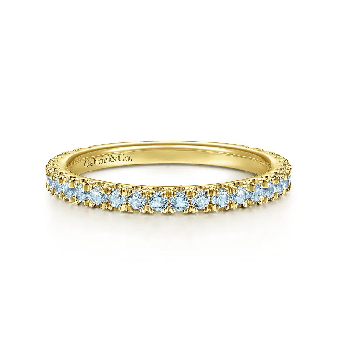 This stunning 14K Yellow Gold Blue Topaz Stackable Ring features a sleek and modern design, perfect for adding a pop of color to your jewelry collection. Adorned with sparkling pave blue topaz stones, this ring catches the light beautifully, offering an elegant and vibrant look. Its stackable design allows for endless styling possibilities, whether you wear it alone for a subtle statement or stack it with other rings to create a personalized, layered look. The luxurious 14K yellow gold setting enhances the brilliance of the blue topaz, making it an ideal choice for both everyday wear and special occasions.