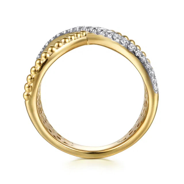 Make a bold statement with this 14K Yellow Gold Bujukan and Diamond Wide Band X Ring. Designed with a striking X motif, one half of the “X” features signature Bujukan beaded detailing, while the other half is adorned with .25 carat total weight of brilliant diamonds, creating a captivating contrast of texture and sparkle.