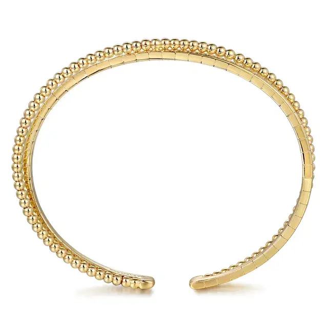 Elevate your jewelry collection with this stunning 14K Yellow Gold Bujukan Twisted Bangle. Designed with modern sophistication, this bracelet features two beautifully contrasting bars—one adorned with signature Bujukan bead detailing and the other crafted in sleek, polished gold. The two elements twist gracefully together, creating a refined, dimensional look that’s both timeless and contemporary.