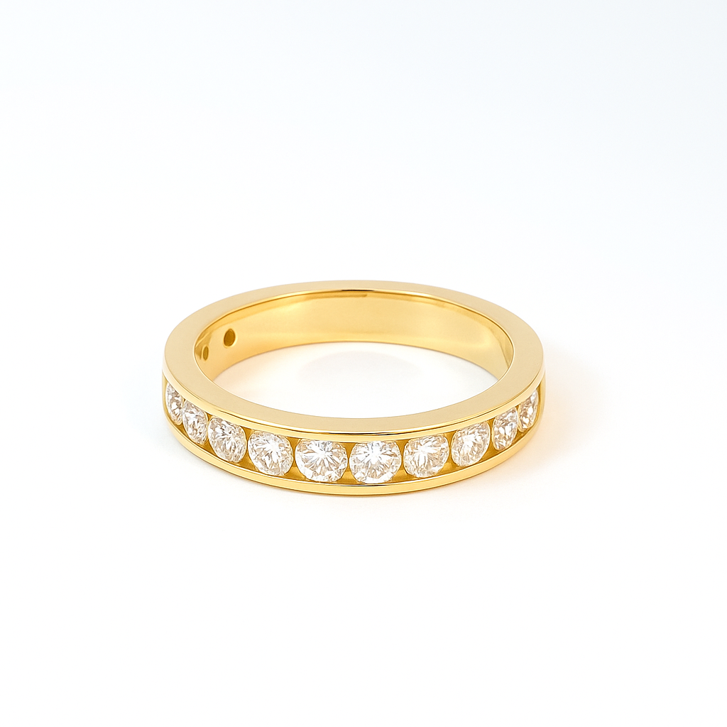 This stunning 14K Yellow Gold Diamond Channel Set Band exudes elegance and sophistication. Featuring a total weight of .72ctw, it showcases 11 round diamonds expertly set within a sleek channel design. The diamonds' brilliant sparkle is complemented by the warm glow of the yellow gold, making this band a perfect choice for both everyday wear and special occasions. Whether worn alone or paired with an engagement ring, this timeless piece adds a touch of luxury and refinement to any jewelry collection.