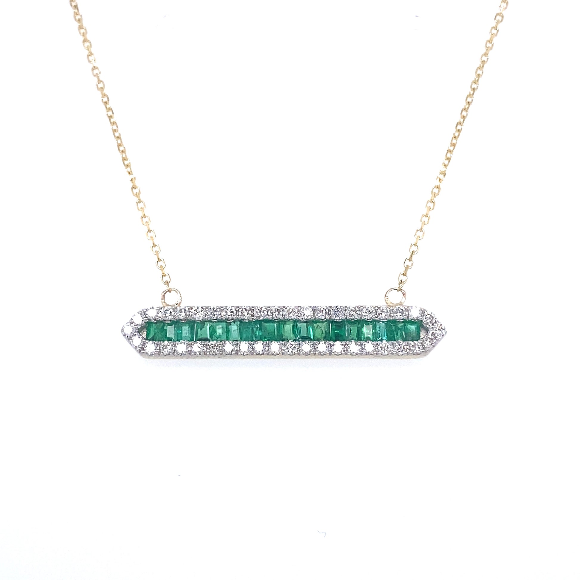 There's glitter on the horizon when you wear this fashionable sideways diamond and gemstone bar necklace set in 14k yellow gold. Glistening with pave diamonds and baguette emeralds, this horizontal bar necklace is sure to please.