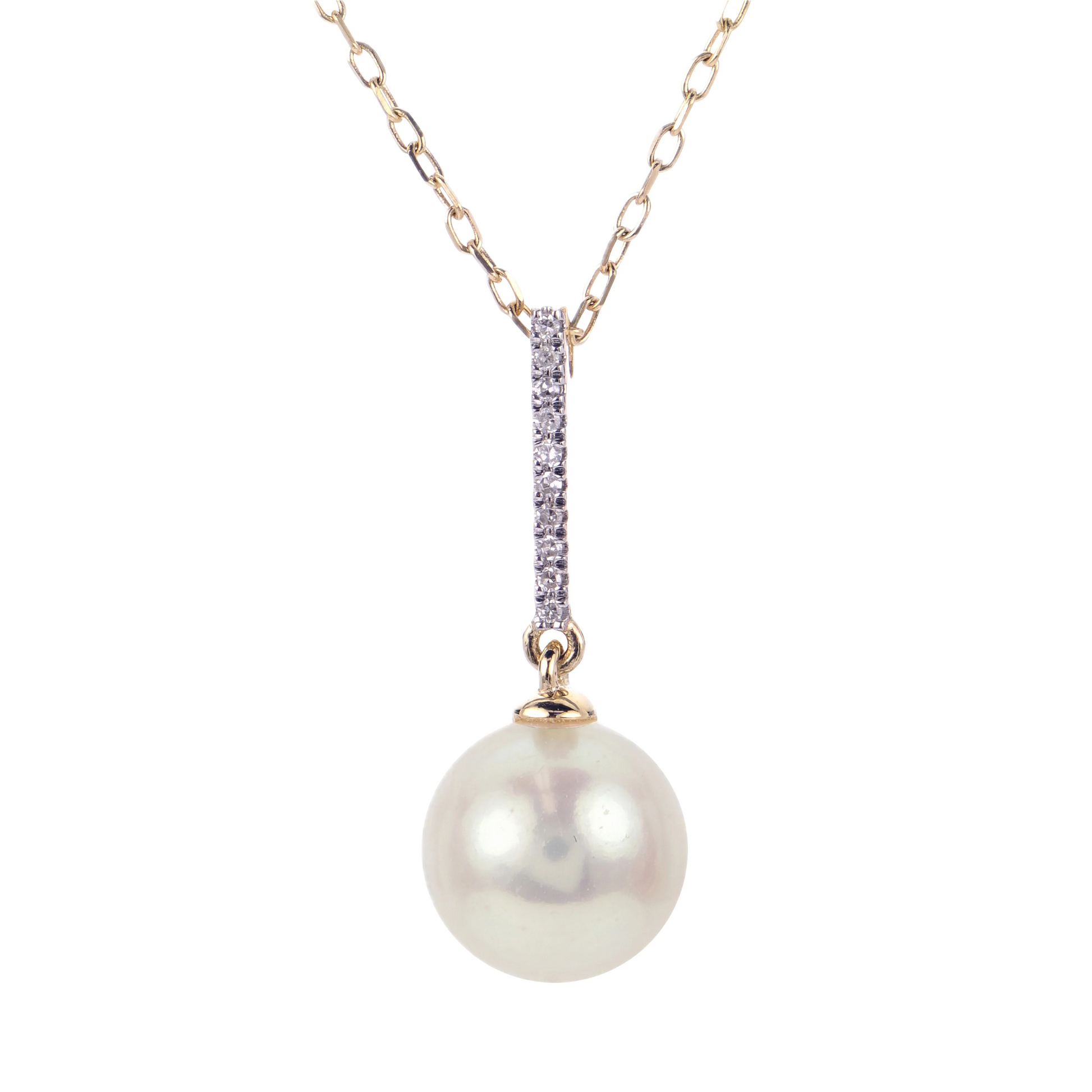 Above the pearl, a sleek pavé-set diamond bar adds a subtle yet radiant sparkle, featuring .04 carat total weight of genuine diamonds. The pendant is gracefully suspended from an 18-inch 14K yellow gold chain, offering a flattering length that pairs beautifully with any neckline.