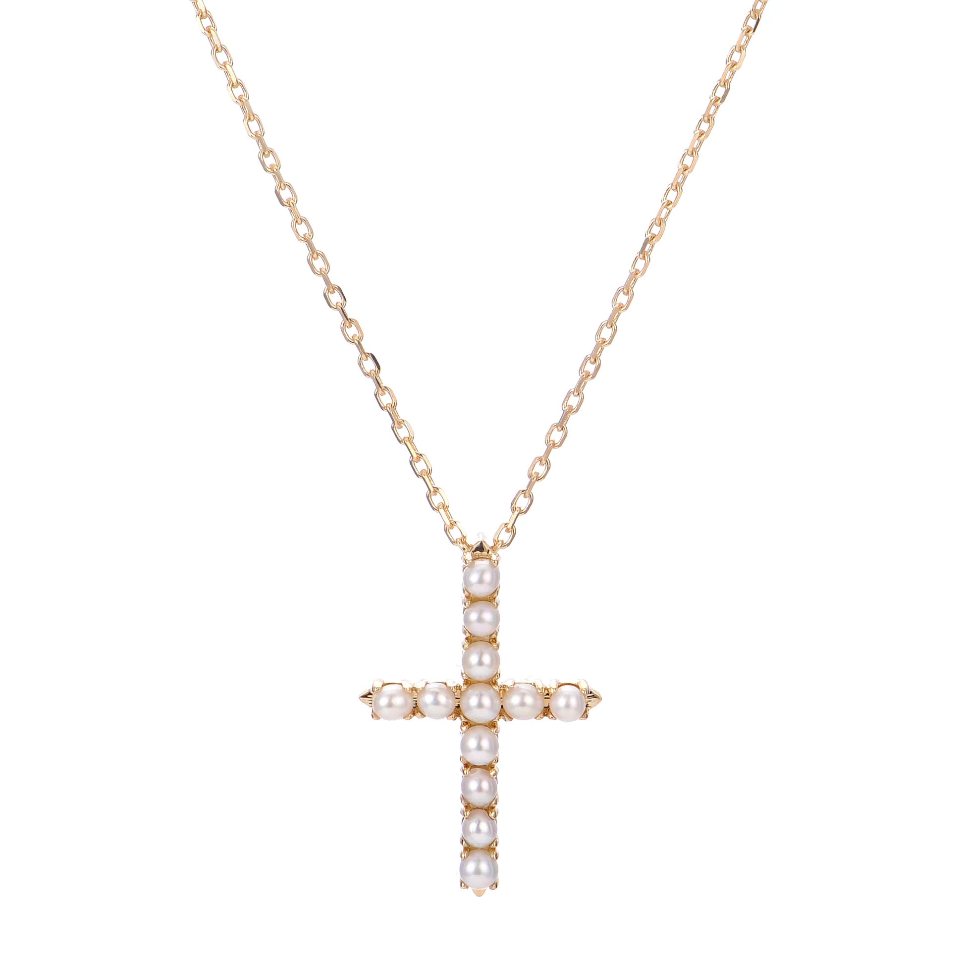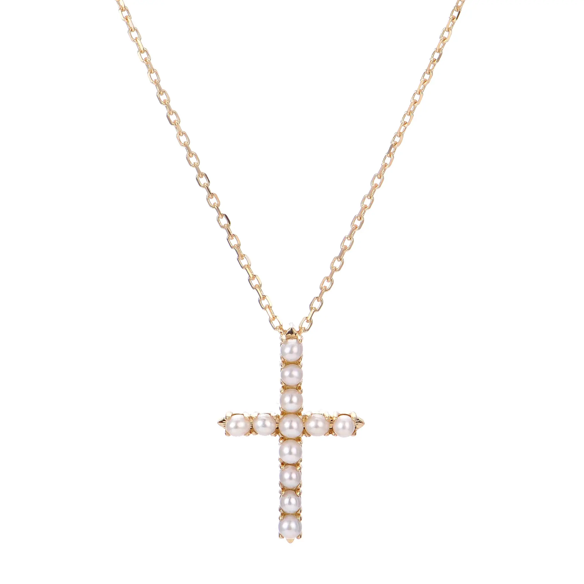 Timeless faith meets natural beauty in this 14K Yellow Gold Freshwater Pearl Cross Pendant. Delicately crafted, each arm of the cross is formed by luminous cultured freshwater pearls, creating a graceful and meaningful silhouette that radiates purity and elegance.