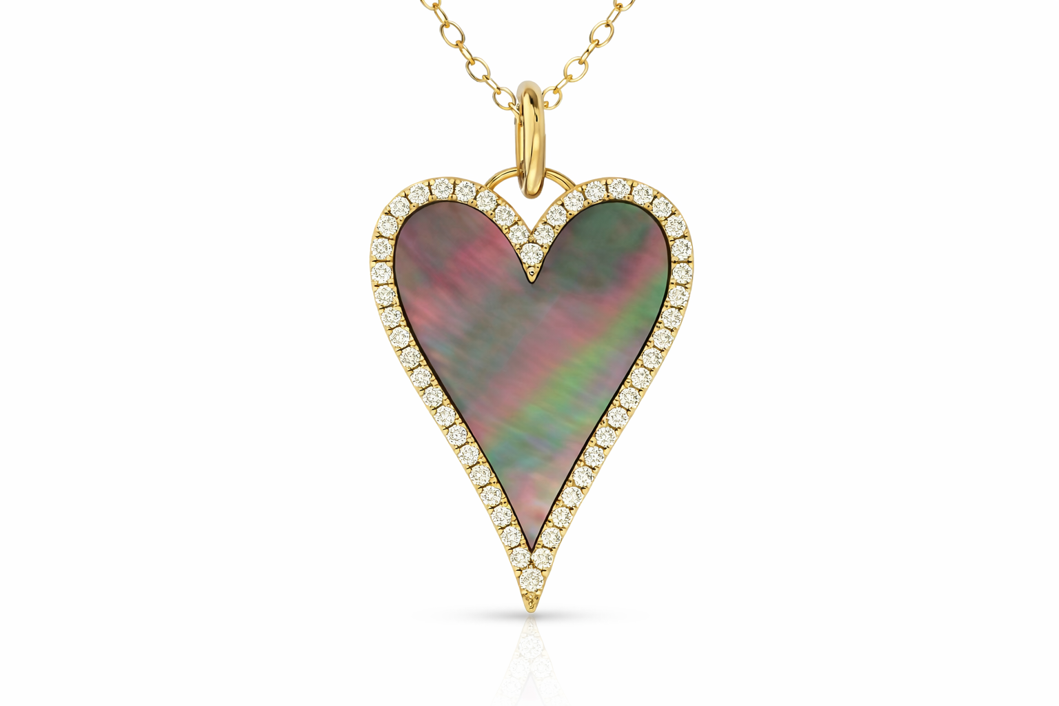 Soft, luminous, and endlessly meaningful, this grey mother-of-pearl and diamond heart pendant is a modern take on a timeless symbol of love. Crafted in 14K yellow gold, the heart features an iridescent grey mother-of-pearl center that reflects subtle hues of green, rose, and silver as it catches the light. A delicate halo of round brilliant diamonds frames the silhouette, adding the perfect touch of sparkle.
