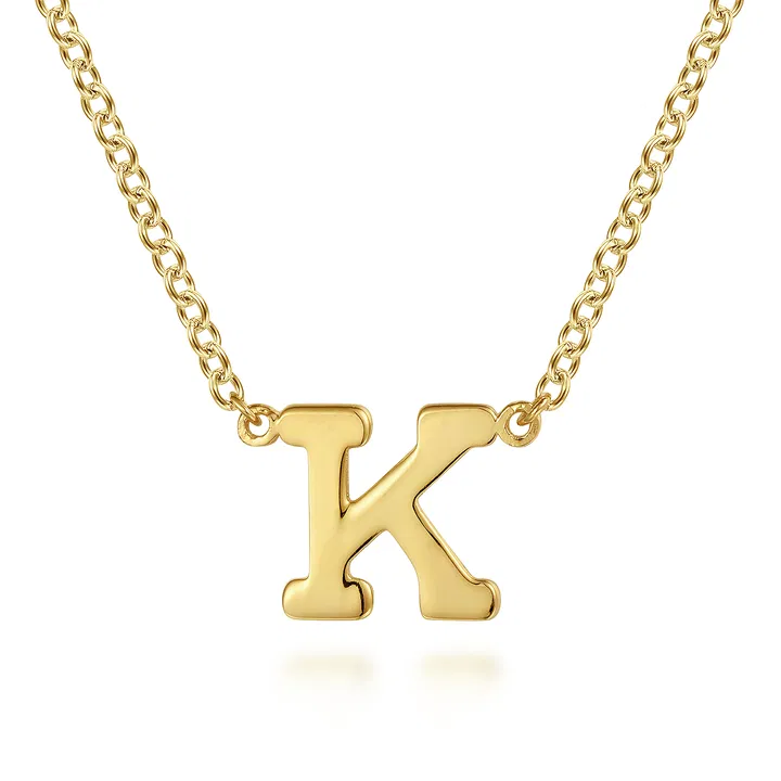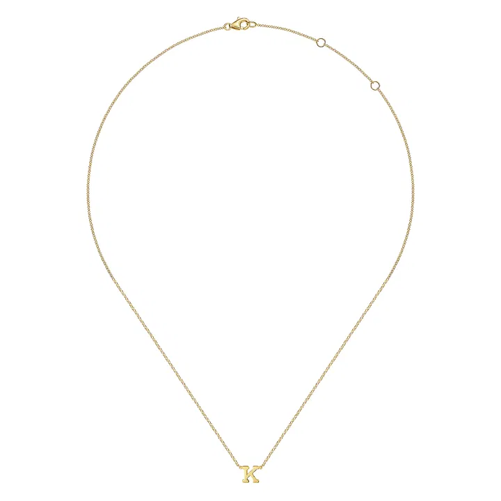 Celebrate personal style with this elegant 14K yellow gold “K” initial necklace. Crafted with a sleek, polished finish, the petite initial pendant offers a timeless look that’s perfect for everyday wear. The piece is suspended from a 17.5-inch chain, allowing it to rest beautifully along the neckline—ideal for layering or wearing on its own.