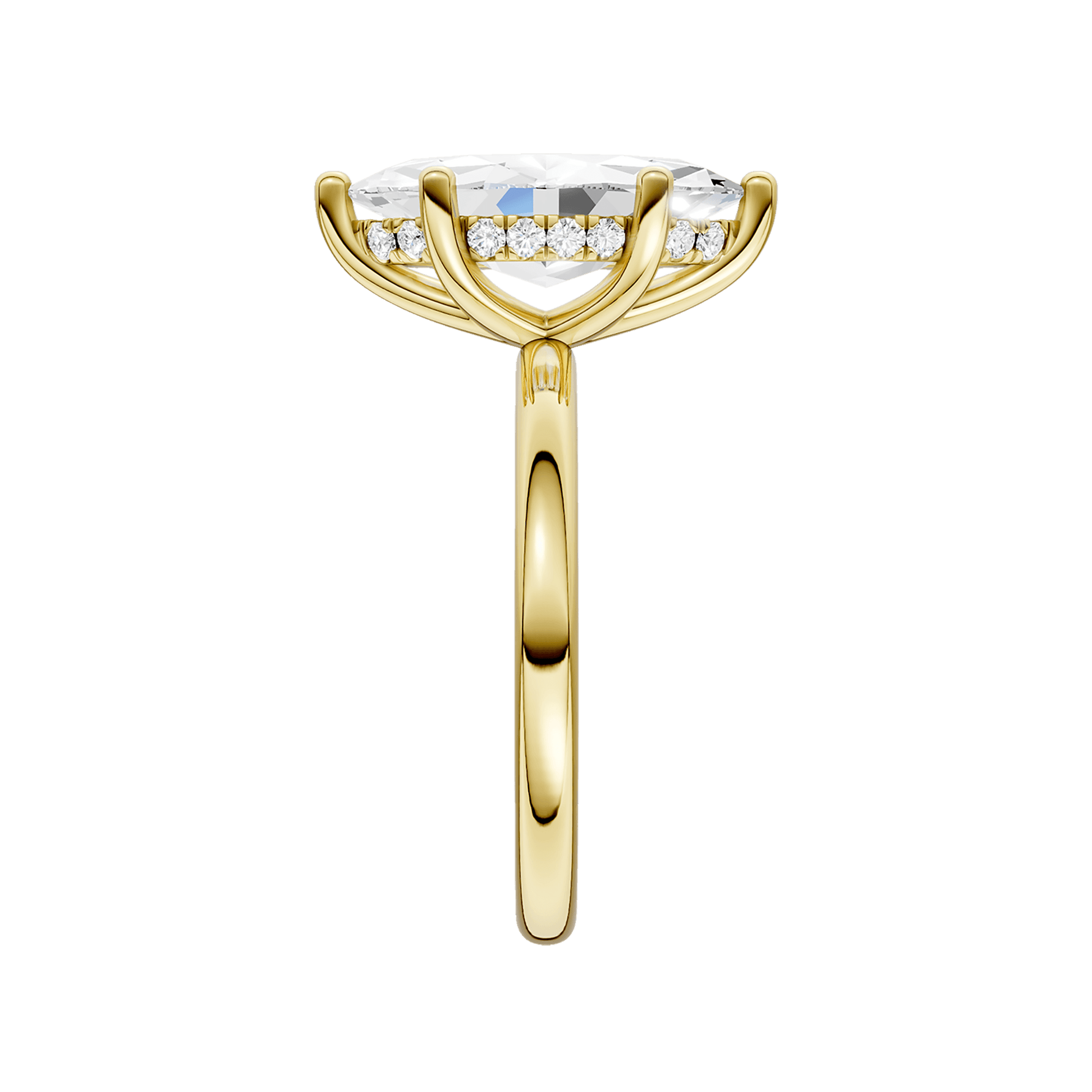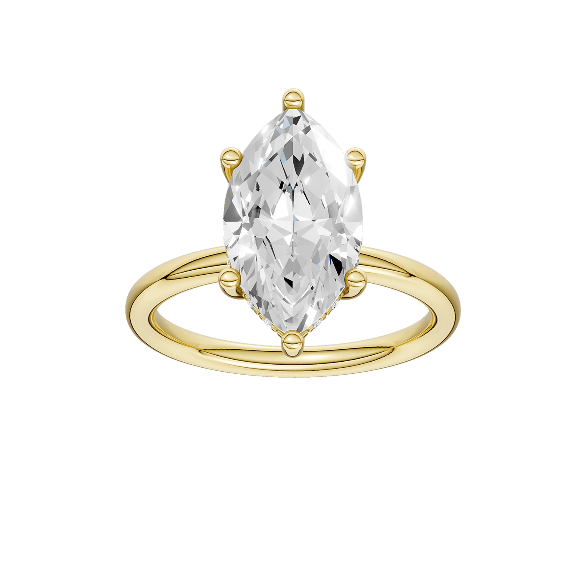 Introducing our Lab Grown Diamond Hidden Halo Engagement Ring, expertly crafted in 14KT yellow gold and adorned with a total of 3.18 carats total weight. The centerpiece of this exquisite ring is a stunning marquise-cut diamond, weighing 3.06 ct, boasting E/F color and VS clarity, and certified by IGI for authenticity and quality. With its latest and modern design, this ring captures both contemporary trends and the timeless elegance of a classic era, making it a symbol of enduring love and style.