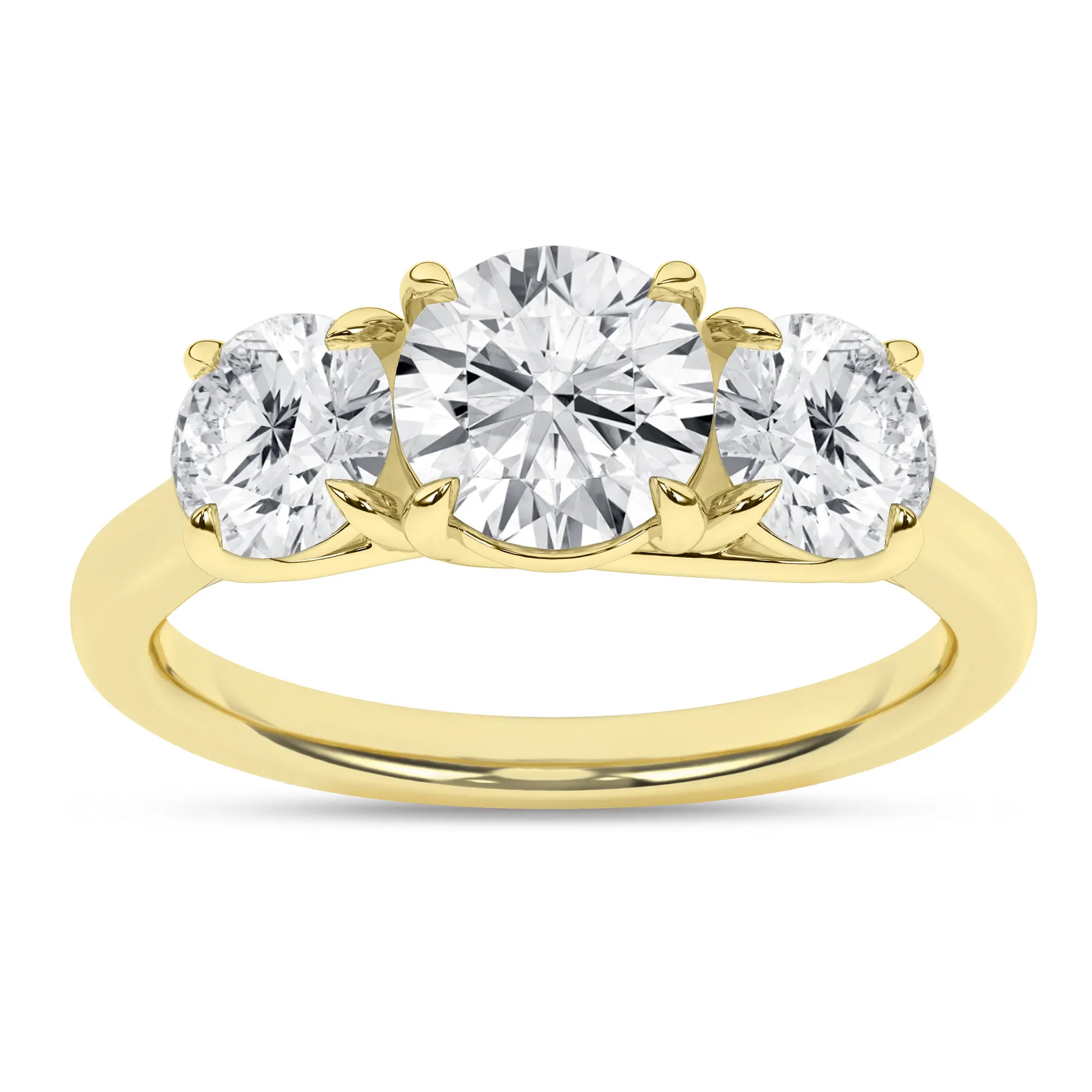 Discover the timeless elegance of our Lab-Created Diamond Ring, a masterpiece featuring three magnificent round-cut diamonds seamlessly set in a row, creating a harmonious display of radiant beauty in 14KT gold. This exquisite ring is set with 2.97 ctw of diamonds. The center round-cut stone is a dazzling 1.55 ct, while the sides boast equally stunning 1.42 carats total weight of diamonds. With EF color diamonds and VS clarity, this ring sparkles with unmatched brilliance, making it a remarkable symbol of your enduring love and commitment.