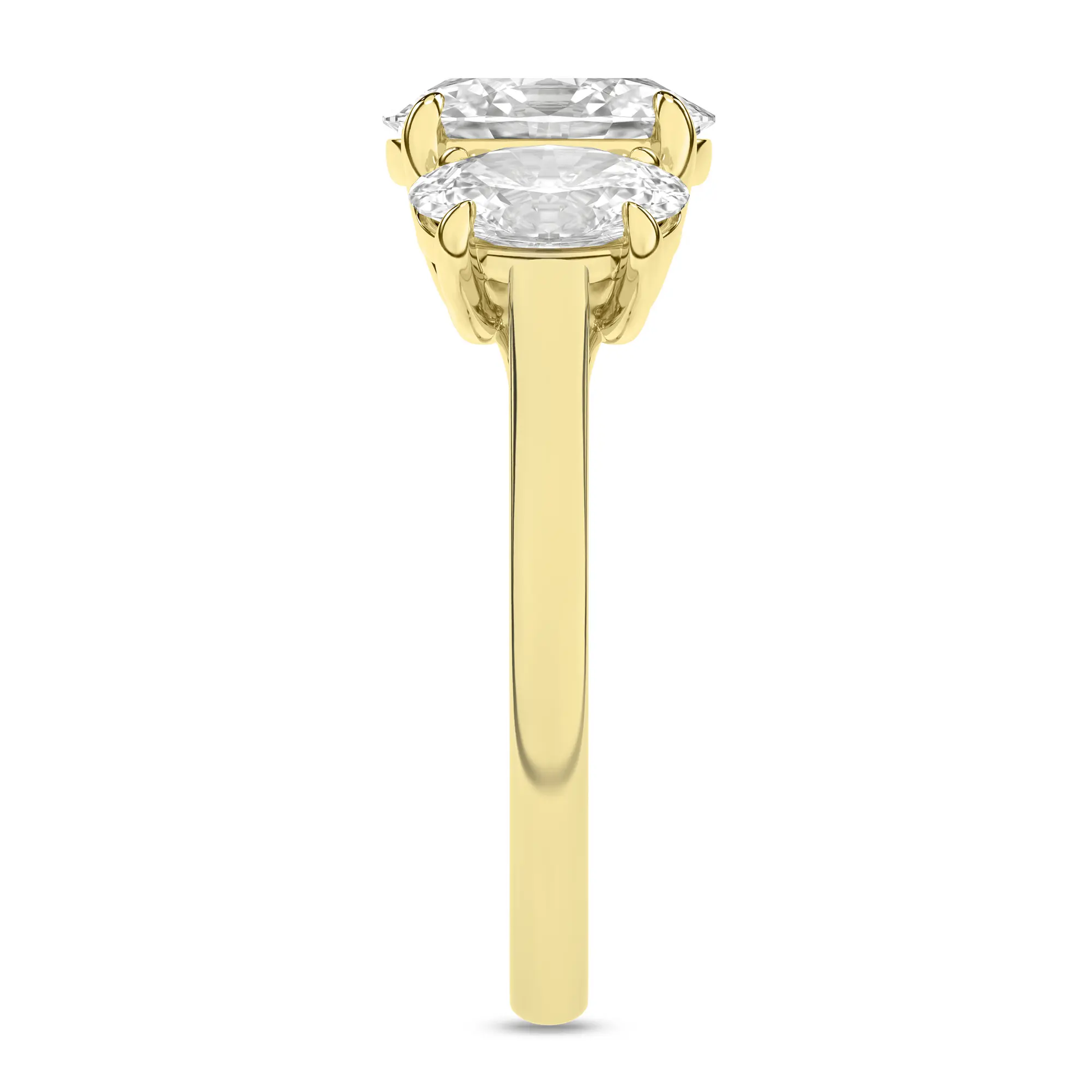 Experience the allure of our alluring oval lab-created Diamond Ring, a true masterpiece featuring three brilliant oval-cut diamonds seamlessly set in a row, creating a harmonious display of radiant beauty in 14KT yellow gold. This exquisite ring is studded with 3.06 carat total weight of diamonds, each one certified by IGI for authenticity and quality assurance. The center oval-cut stone is a dazzling 1.52 ct, while the sides boast equally stunning 1.54 carats total diamonds. With EF color diamonds and VS clarity, this ring sparkles with unmatched brilliance, making it a remarkable symbol of your enduring love and commitment.
