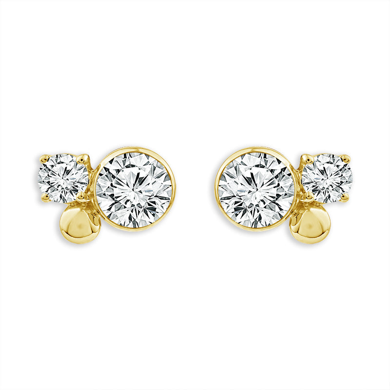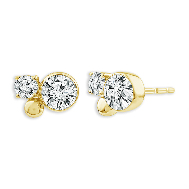Modern design meets timeless sparkle in these 14K Yellow Gold Lab Grown Diamond Skyset Round Cluster Studs. Each earring features a unique trio of round elements: two lab grown diamonds—one bezel-set and one prong-set—paired with a third high-polish gold circle, adding a bold yet balanced contrast.