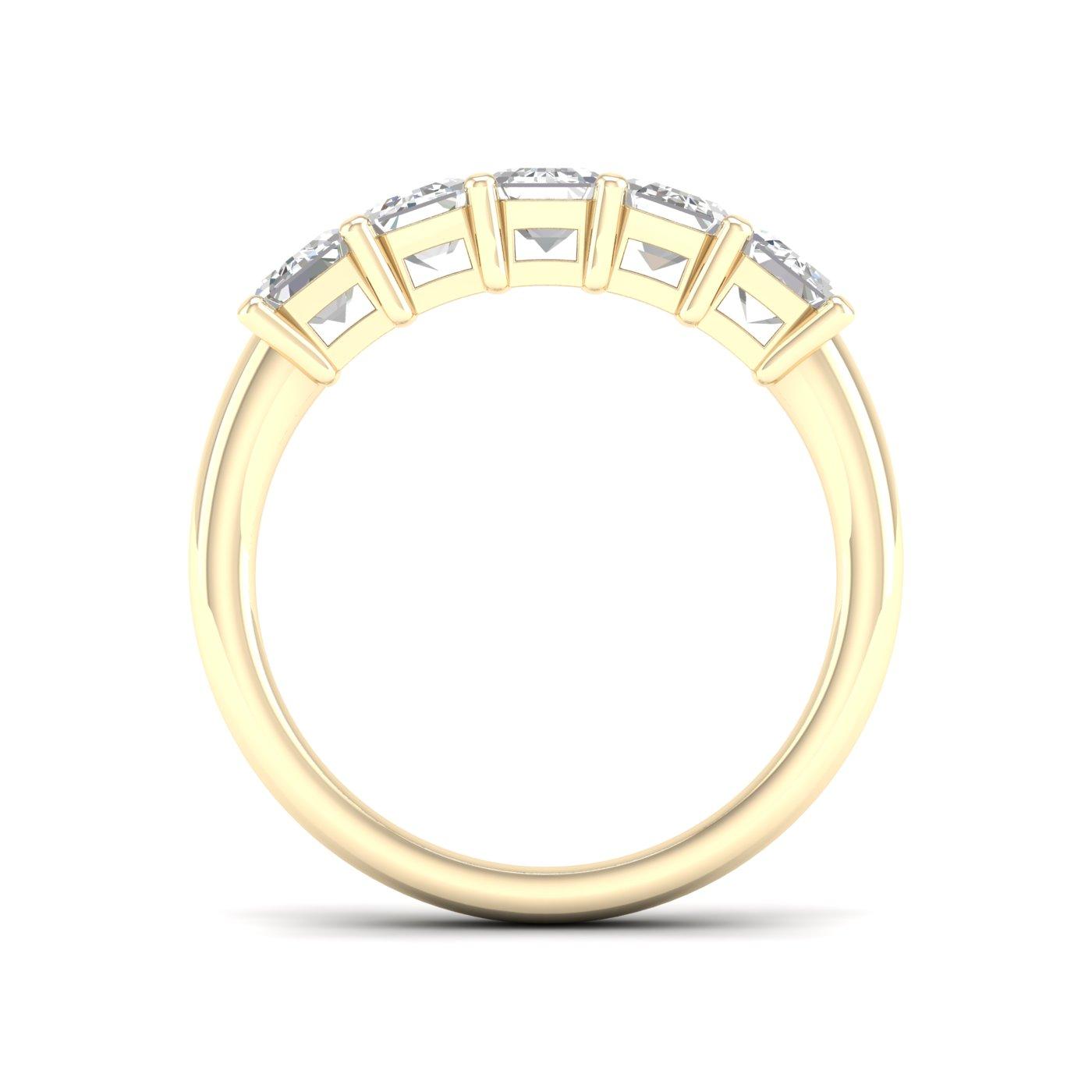 The emerald cut Lab Grown diamond 5-stone band, certified by IGI for quality assurance, is set in 14KT white gold and studded with 2 ctw of diamonds in a timeless four-prong setting. Each emerald-cut Revelation diamond, weighing 3/8 ct., exhibits EF color and VS clarity. This combination of exquisite diamonds and meticulous craftsmanship creates a truly remarkable piece that radiates elegance and sophistication.