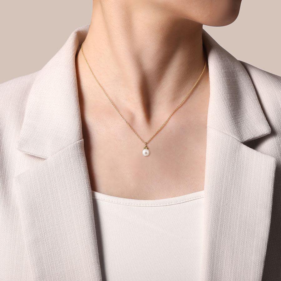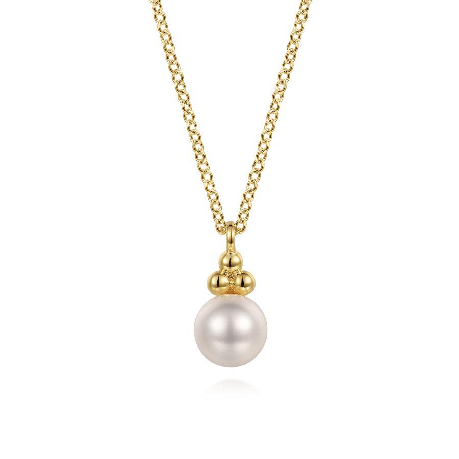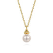 This 14K yellow gold and pearl drop necklace offers a more subtle way to sport June's precious birthstone. A single luminous pearl is suspended from a delicate gold chain and accented by a trio of gleaming golden beads. Ideal for layering with other chains.