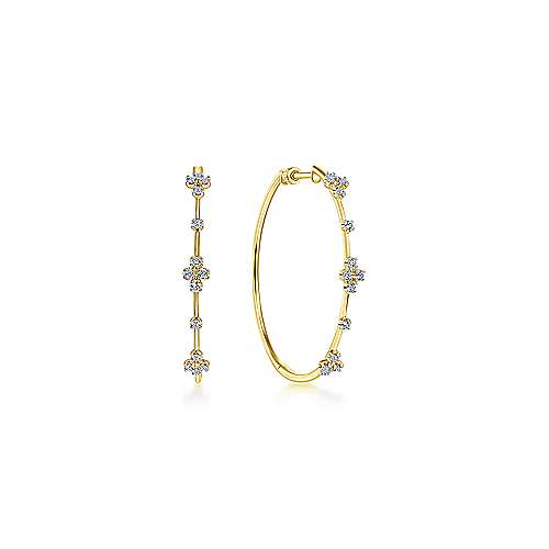 Single round diamonds and sparkling quad clusters are dispersed along the front of each delicate earring. Amidst the diamonds, glossy 14k yellow gold hoops cut a slim but chic silhouette. Channel a modern luxe vibe with these 0.50ctw diamond hoop earrings.