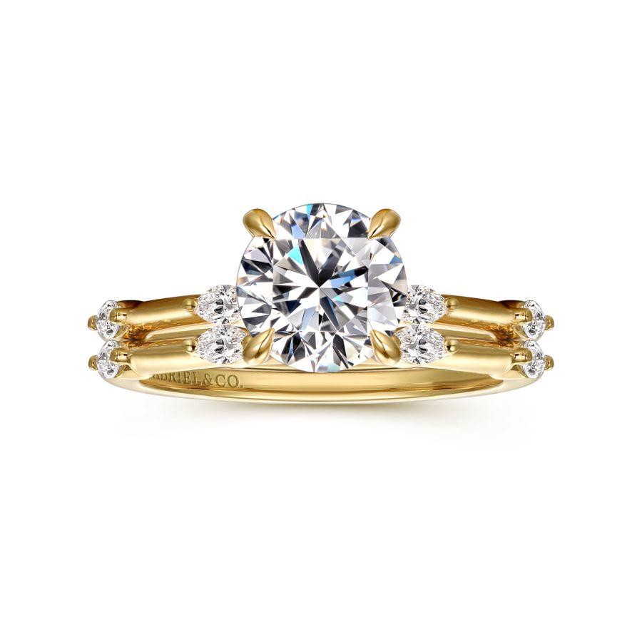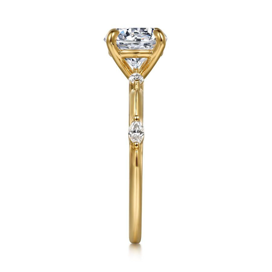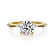 A true embodiment of timeless sophistication, this 14K yellow gold engagement ring invites you to embark on a journey where each diamond station twinkles at every turn. At its heart, a radiant 1.5 ct round-cut diamond commands attention, cradled in a lower minimal head and secured by a single-prong setting that enhances its brilliance. Along the shank, 0.14 ct diamond stations unfold, creating a mesmerizing path of light and grace.
