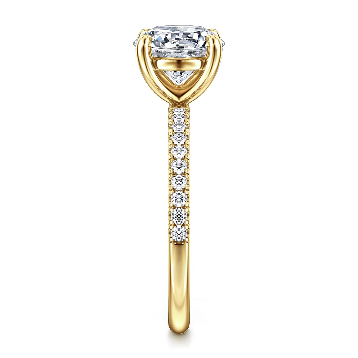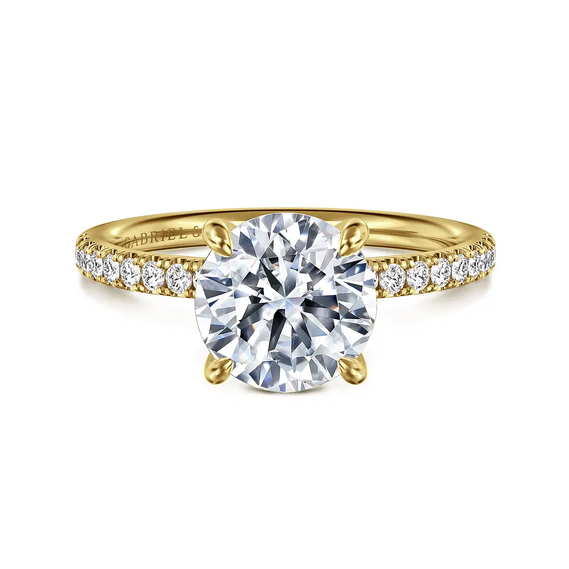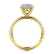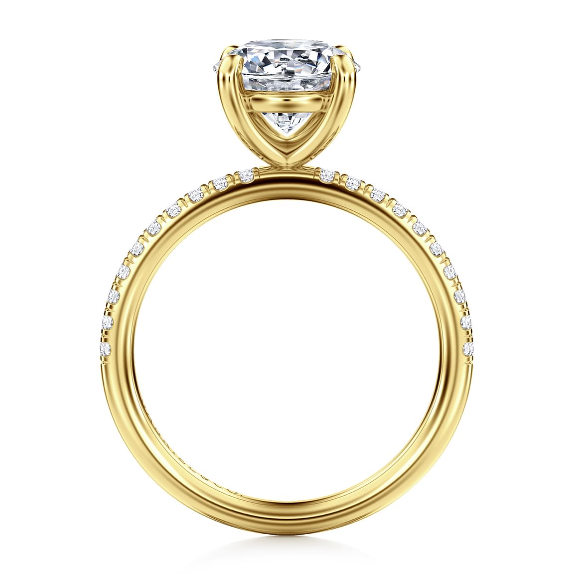 Radiating timeless elegance, this 14K yellow gold engagement ring setting is designed to beautifully highlight your chosen center stone. A shimmering row of .20 carats total weight of pavé-set diamonds delicately trails halfway down the shank, adding brilliance without overpowering the center. The classic round head is crafted to securely hold a round diamond or gemstone of your choice, making this setting a perfect blend of sophistication and personal expression.